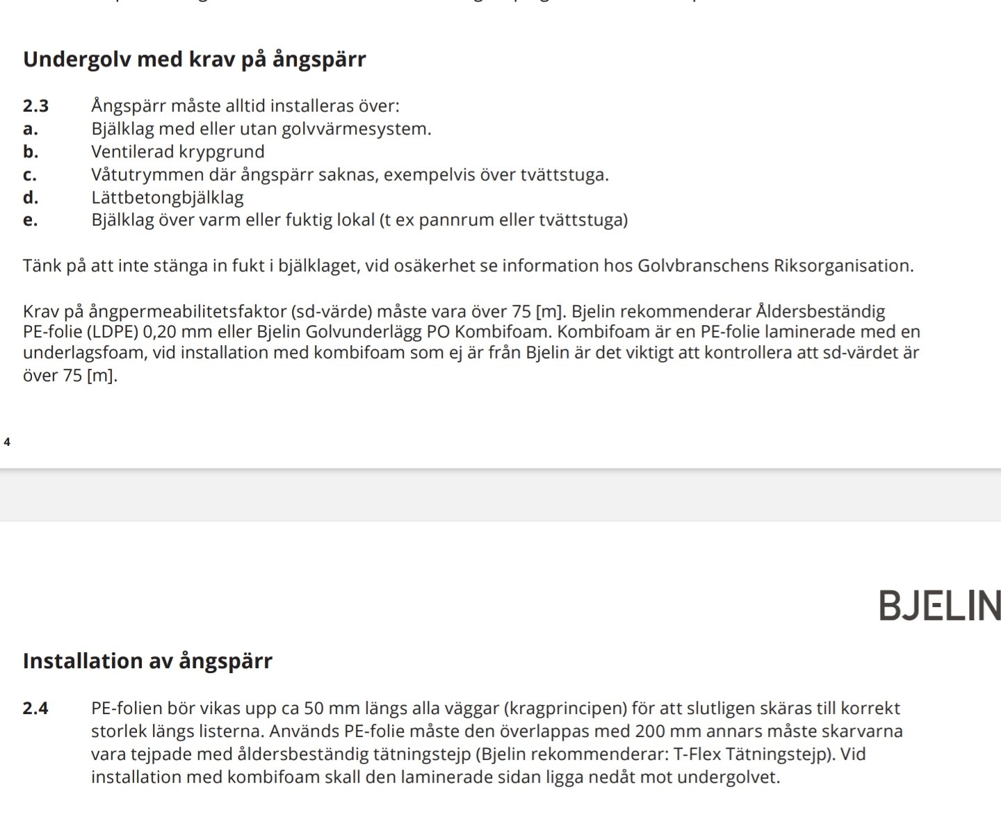 Skippa ångspärr som sagt. Du har inga förutsättningar som kräver det rent byggtekniskt.É ÉlPon skrev:Vad menas med uppvik på vägg? Mot väggens ångspärr blir ju svårt om man som jag gjort väggar före parkett (samt innerväggar). Ska man vika upp och tejpa mot gipsväggen då?