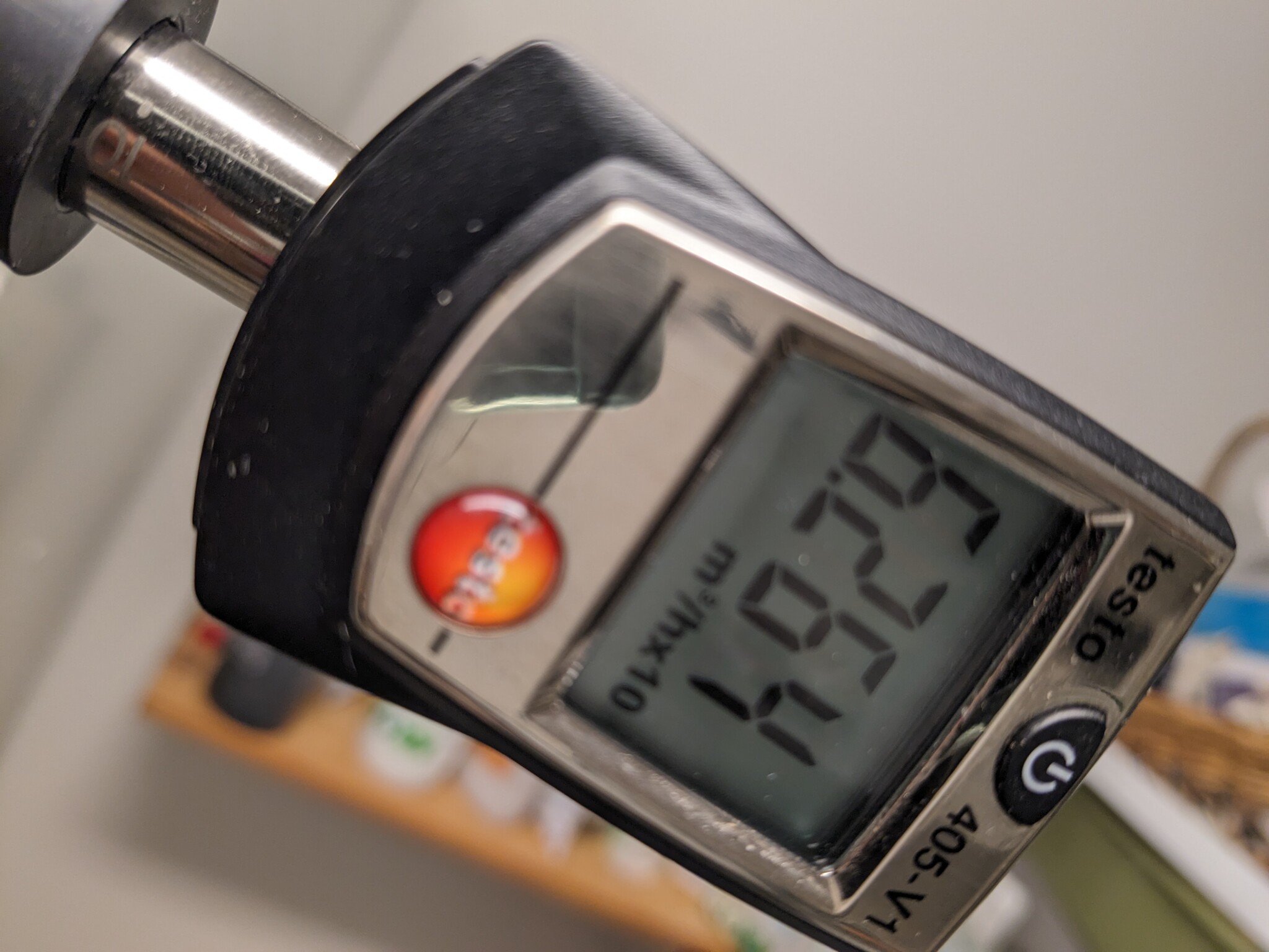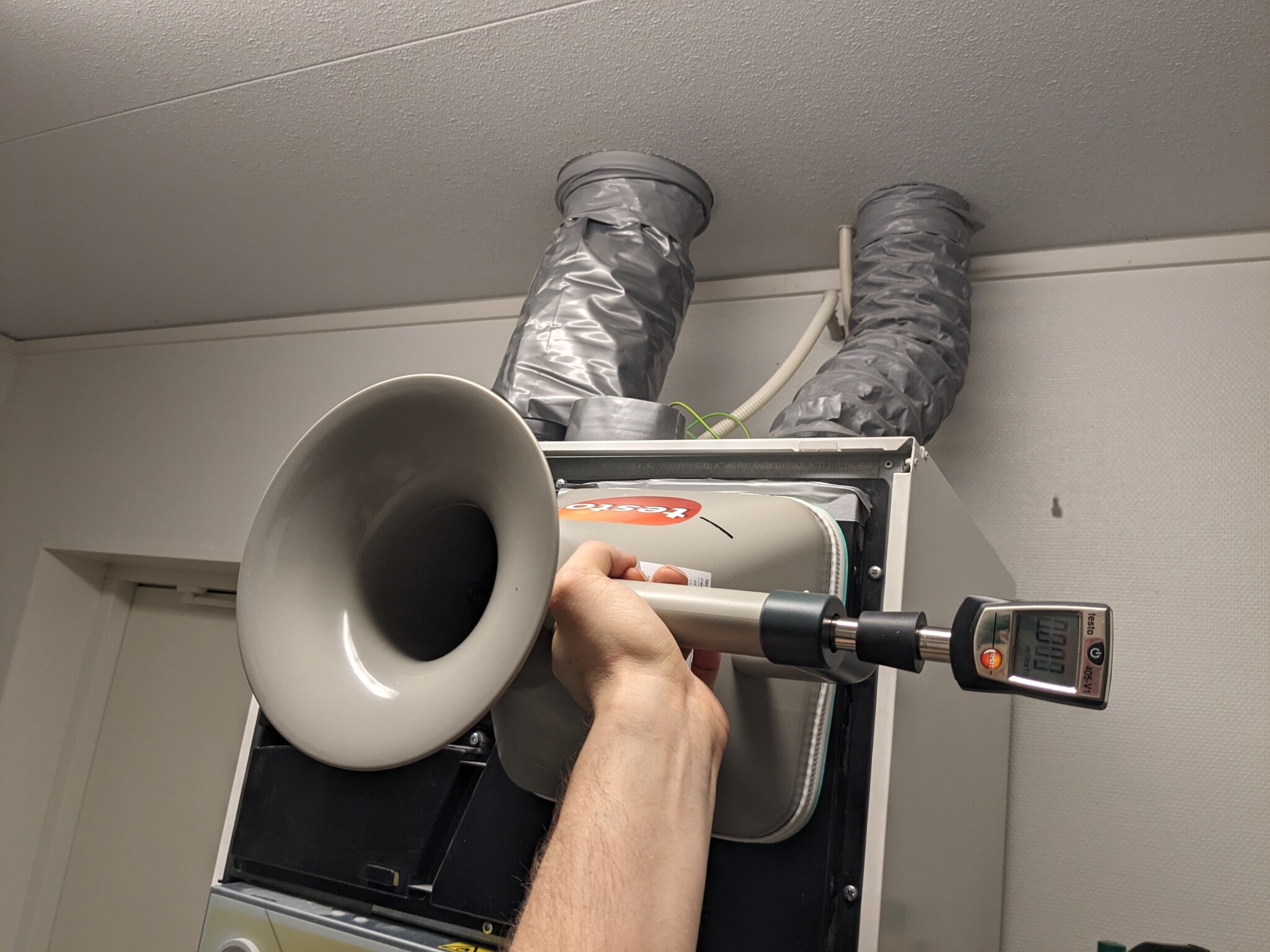 Vi upplever luften som lite kvav i sovrummet och jag har hyrt en Testo 405-v1 med stos och mätt lite själv nu senaste dagarna på både friskluft ventilerna men fokuserat på frånluften. Och om jag mätt rätt så ligger vi på ca 1/3 av förväntat flöde och då har jag till och med öppnat upp NIben och kopplat i "plint 22" så så forcerings läget på fläkten är max, dvs alla 230V