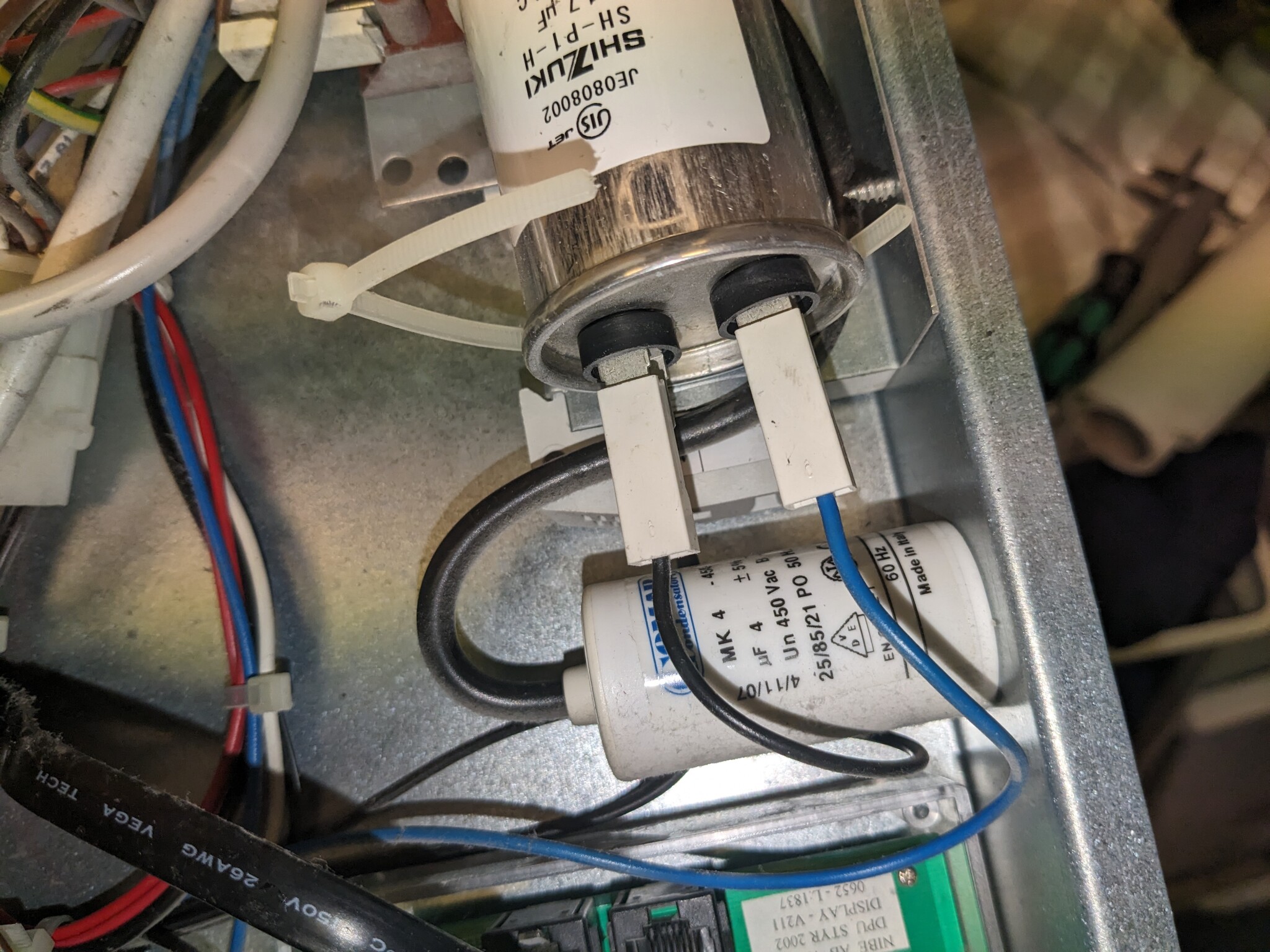 Verkar ju vara väldigt enkelt att byta, min sitter inte ens skruvad utan det är bara att lyfta den rakt upp, så länge man är försiktigt och inte skadar kopparören. Men det kanske är värt att bara mäta kondingen först, antar att det är den den nedre av dessa?