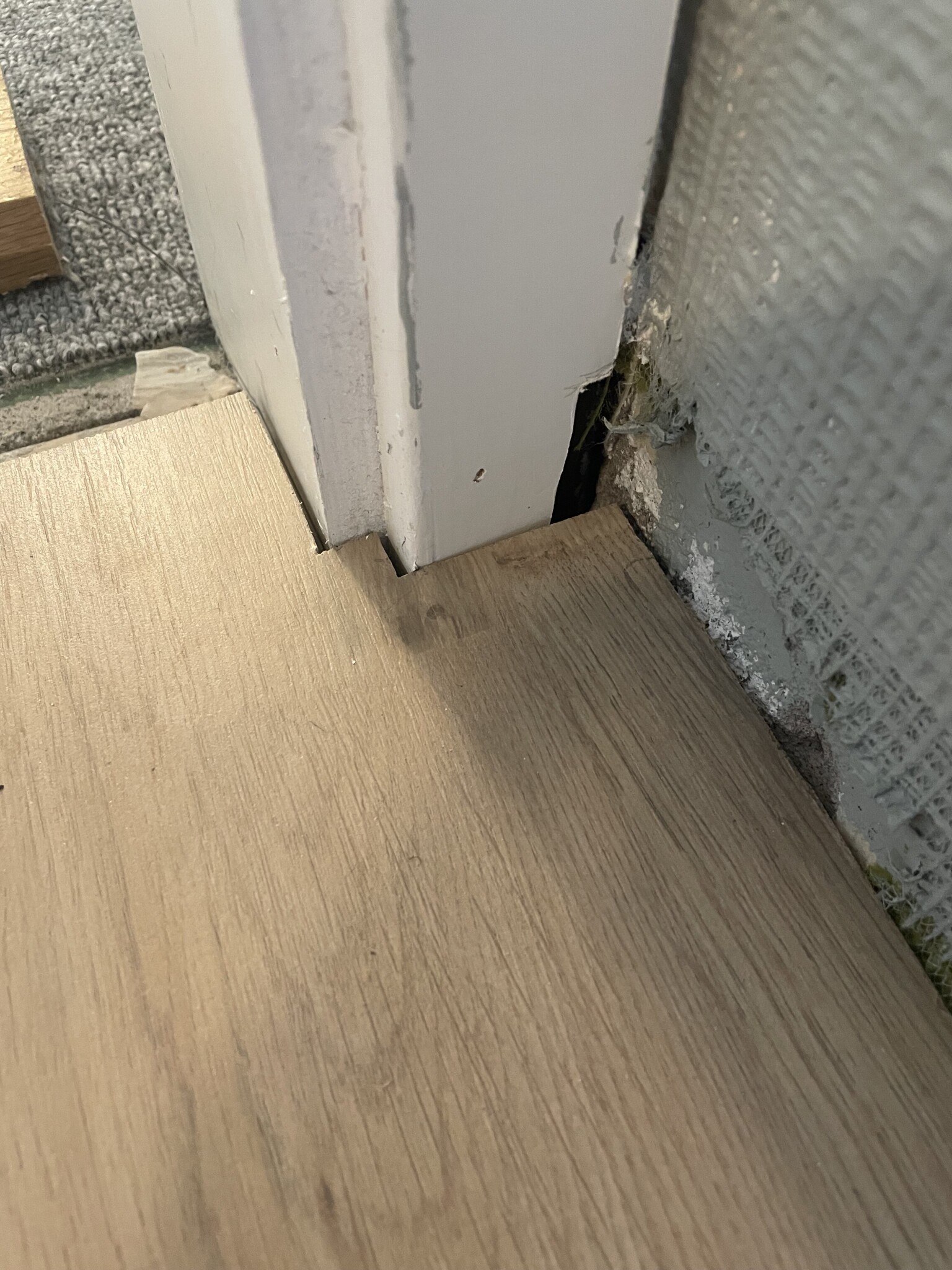 Är klara med golv läggningen. Klickgolv av sämre kvalité, rusta. Min man sågade fint vid dörrposten. Men jag upptäckte sedan att golvet rest sig och jag räknade ut för att det är för hårt tryck mot där han sågat då det inte är någon rörelsemån. Jag vill helst ta upp golvet och såga i karmen för att få in golvet under, men vi är av olika åsikter. Vad annars att göra?