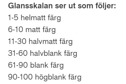 Hittade nu en tråd här på samma tema - någon som ville ha glans 5, men blev varnad om att blank eller halvmatt färg är bättre till bl.a kök. Enligt nedan skala är tydligen 5 = helmatt, medans halvmatt = 11-30.