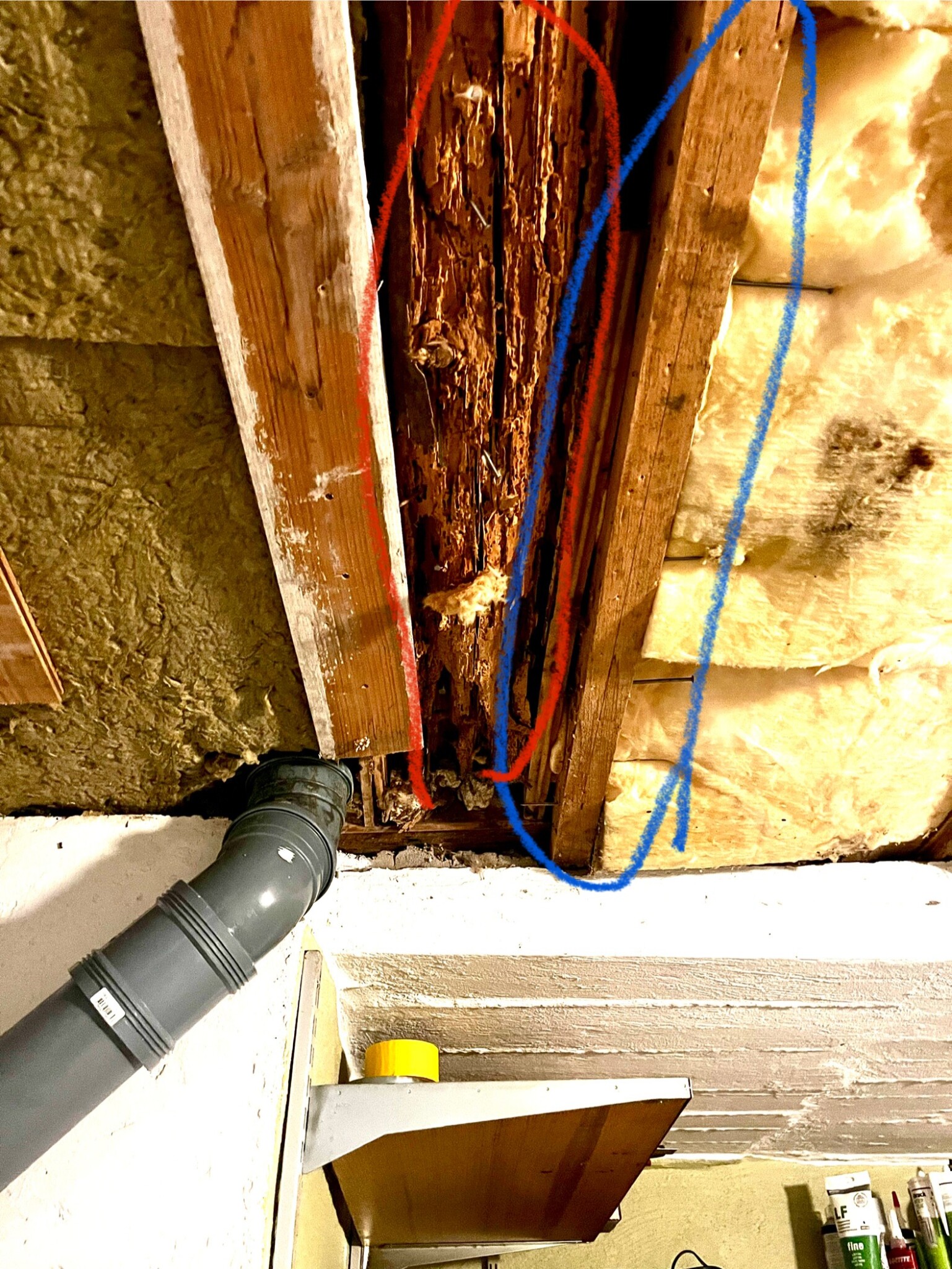 River ner det och ser att det gamla bjälklaget(rött) har varit genom ruttet en gång i tiden och där är ett nytt (blått)som är helt friskt och i bra skick men min fråga är då hur vanligt är det och är det någon annan som har varit med om att man lämnar kvar det gamla bjälklaget ? Är torrt nu men jag kan trycka genom en morakniv genom det gamla utan kraft. Säkert 15-30 år gammal (reparation)