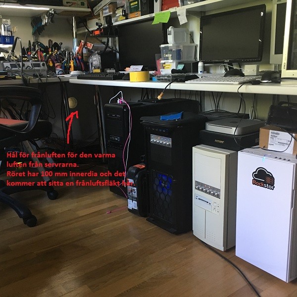 Ja hålet är tvärtemot normalt i nedre delen av rummet men eftersom jag har servrarna under bänkskivan så blockerar den ganska effektivt den varma uppflödet och jag tänkte som sagt dra kanaler från hålet utefter väggen därbak ut till resp server.