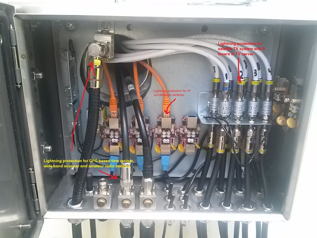 Här ovan ser man även min "intagslåda" för mina antennkablar, videoövervakningskablar samt satellit-TV). Öppnar man det skåpet så ser man alla åskskydd som är jordade till nergrävd kopparkabel med ett antal jordspett runt huset: