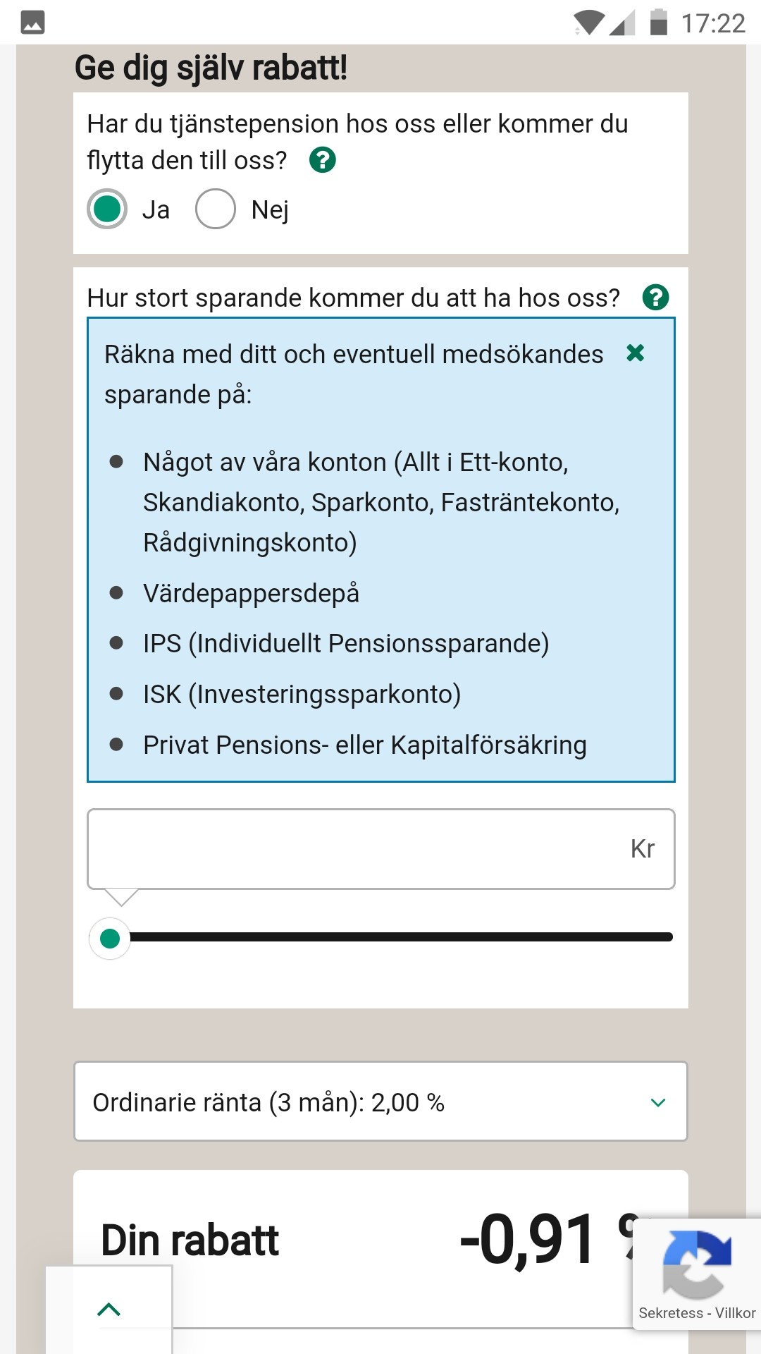 Jag tyckte detta rimmade illa med de annonser där dom angav betydligt lägre ränta än så "till alla". Jag testade att höja värdet i rutan på tjänstepensionen med 100 000 i taget och det hjälpte inte förrän jag kom upp i över en miljon i tjänstepension, då sjönk räntan med hela 0,05%...