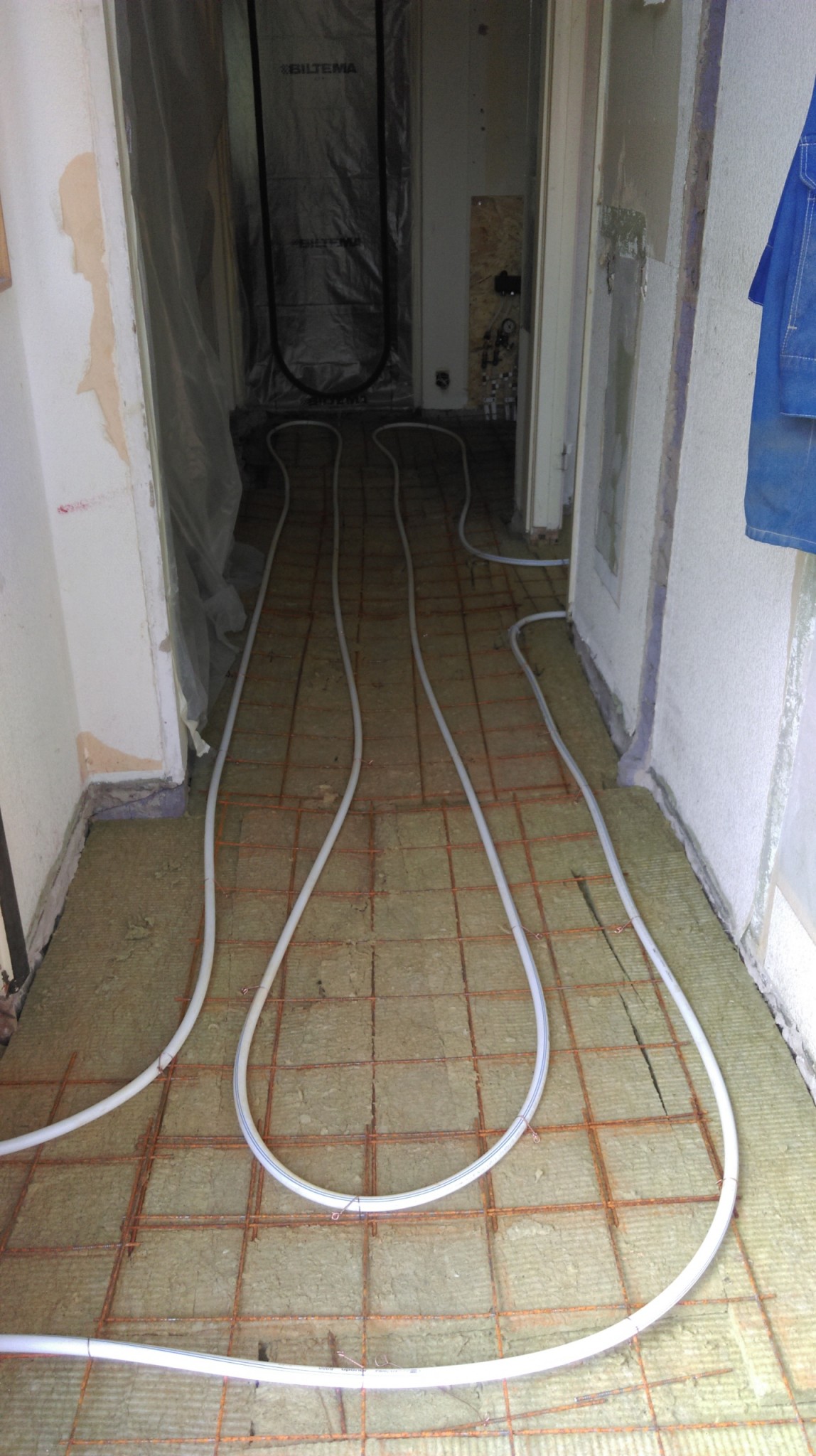 Golvvärmen kommer på plats, har visst ingen bild på det från köket. På detta gjöts sedan någon form av snabb betong som var redo att få klinker bara efter någon/några dagar. Fördelen med golvvärmen förutom att det är skönt när man har klinkergolv är att vi kunde ta bort tre radiatorer och vinna lite plats i den trånga hallen.
