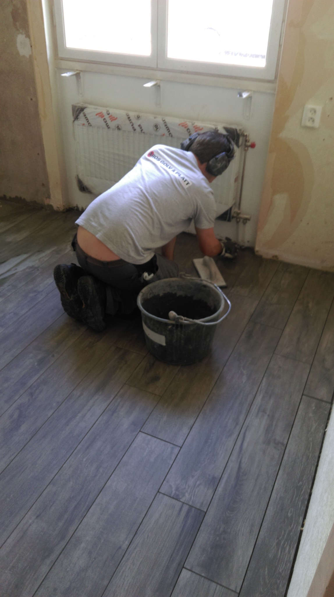 Nu börjar det ta sig ordentligt. Vi valde klinker som påminner om trä i storlek 30x100 (typ) till plattsättarens stora glädje.... Golvet är spacklat men inte flytspacklat så yrkesskickligheten sattes på prov. Det behövs inte mycket ojämnheter för att det ska börja tanda mellan klinkerplattorna.