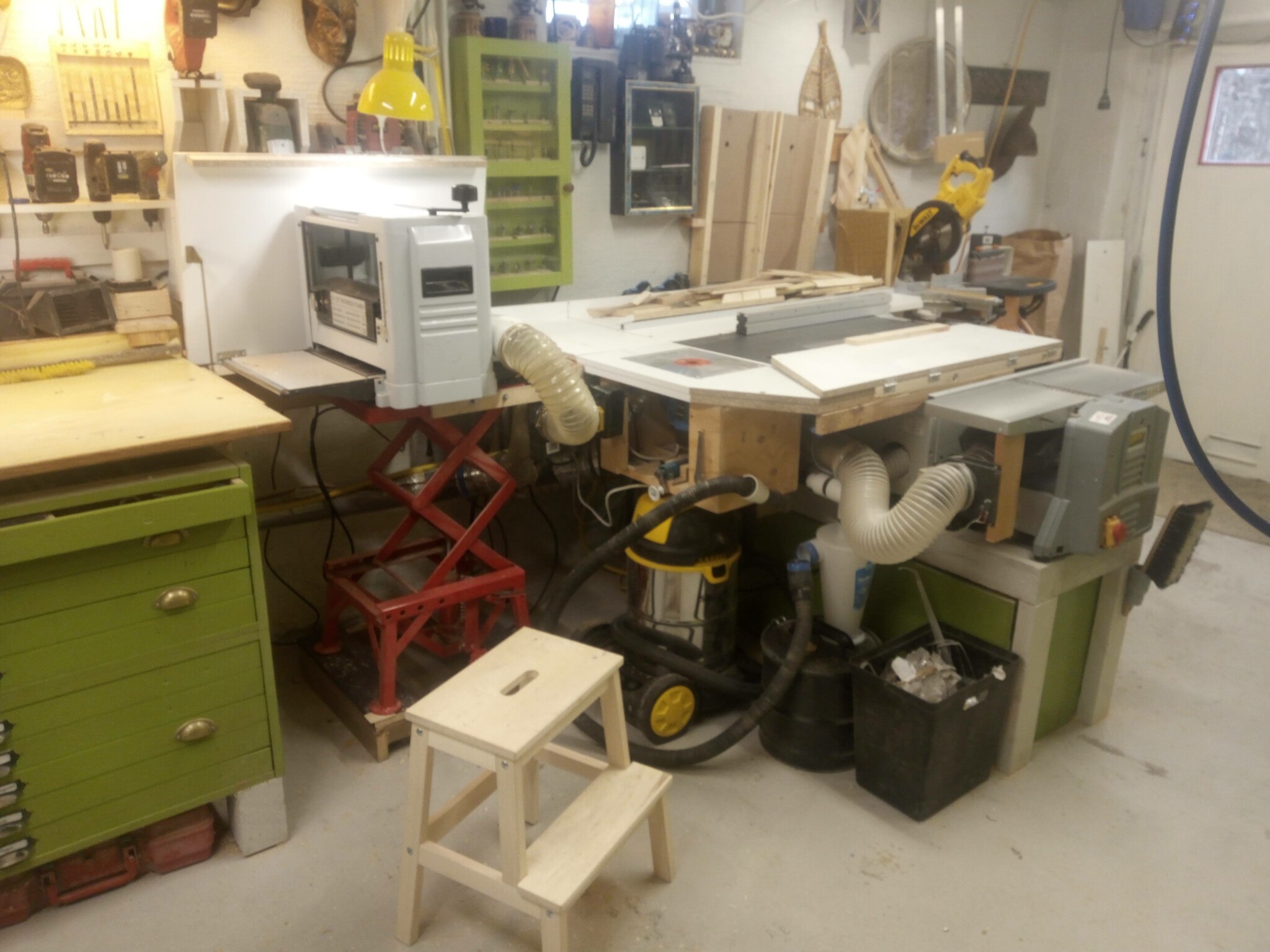 Sedan typ tio år använt en MC-lyft från Jula till hyveln. Inte hundra stabilt men det funkar för mig. Syftet är att kunna sänka ner den under bänken när den inte används. Förut när jag hade en kombinerad rikt- och planhyvel kunde jag reglera arbetshöjden också...