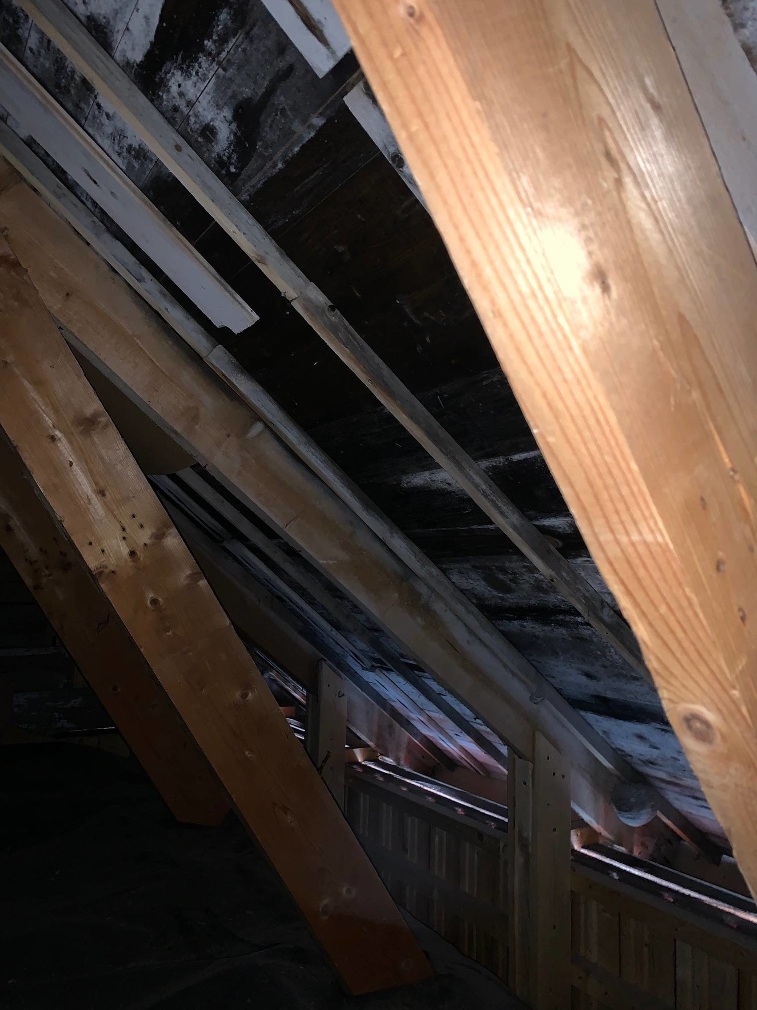 Enligt en besiktningsman så har sådan kraftig mögelpåväxt uppstått pga att vi ej har någon frånluftsventilation på övervåningen tillsammans med att fönstrena är bytta 2011.Dvs att varm luft inifrån kondenserar mot råsponten osv. Konstruktionsmässigt verkar det vara ok, nockventilation på båda gavlarna samt luftspalt upp till nock. De rekommenderar att sanera till och börja med.