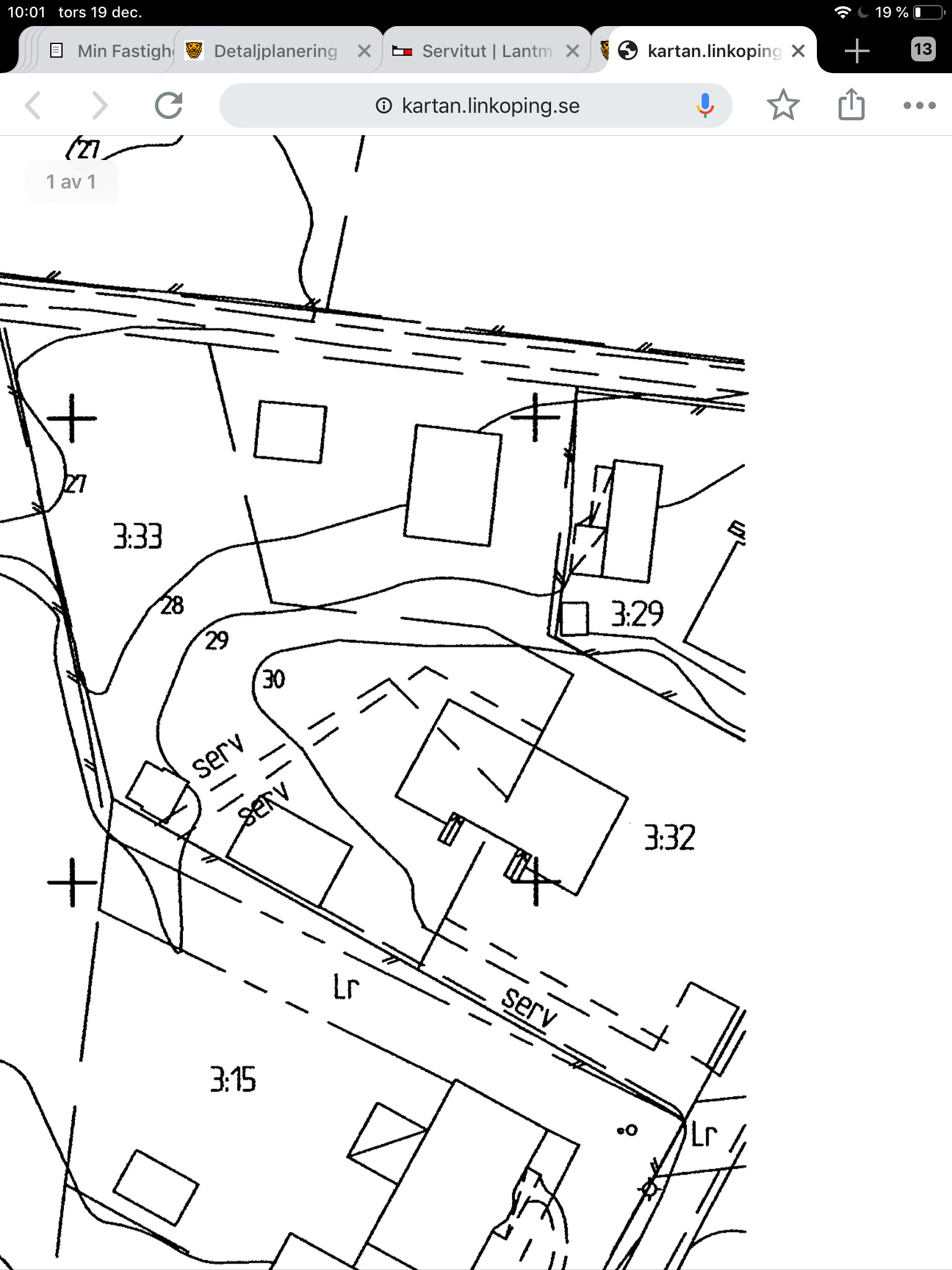 Detaljplanen gäller strax söder om där bilden slutar och är ointressant för min frågeställning. Men det som idag heter 3:33 verkar hetat något annat för 15 år sedan. 3:30 har i den här kartan inte tillgång till dubbelgaraget eller har det möjligen genom servitutet på 3:29. Jag förstår inte heller om som idag står på norra delen av 3:32 hör till 33, 28 eller 32 enligt den här gamla skissen.