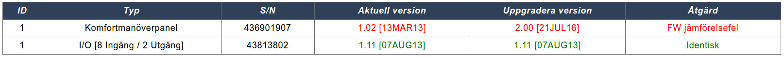 Och här är motsvarande meddelanden från FlexC Händelselogg i centralen: