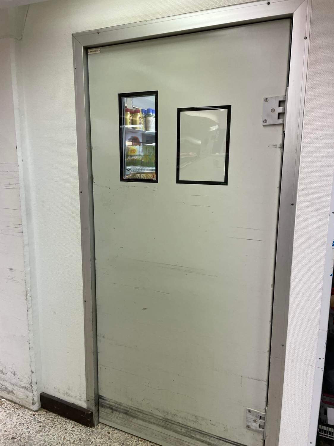 Dörren är på ett lager i en butik och på andra sidan dörren är det ett kylrum. Inga utrymningskrav.