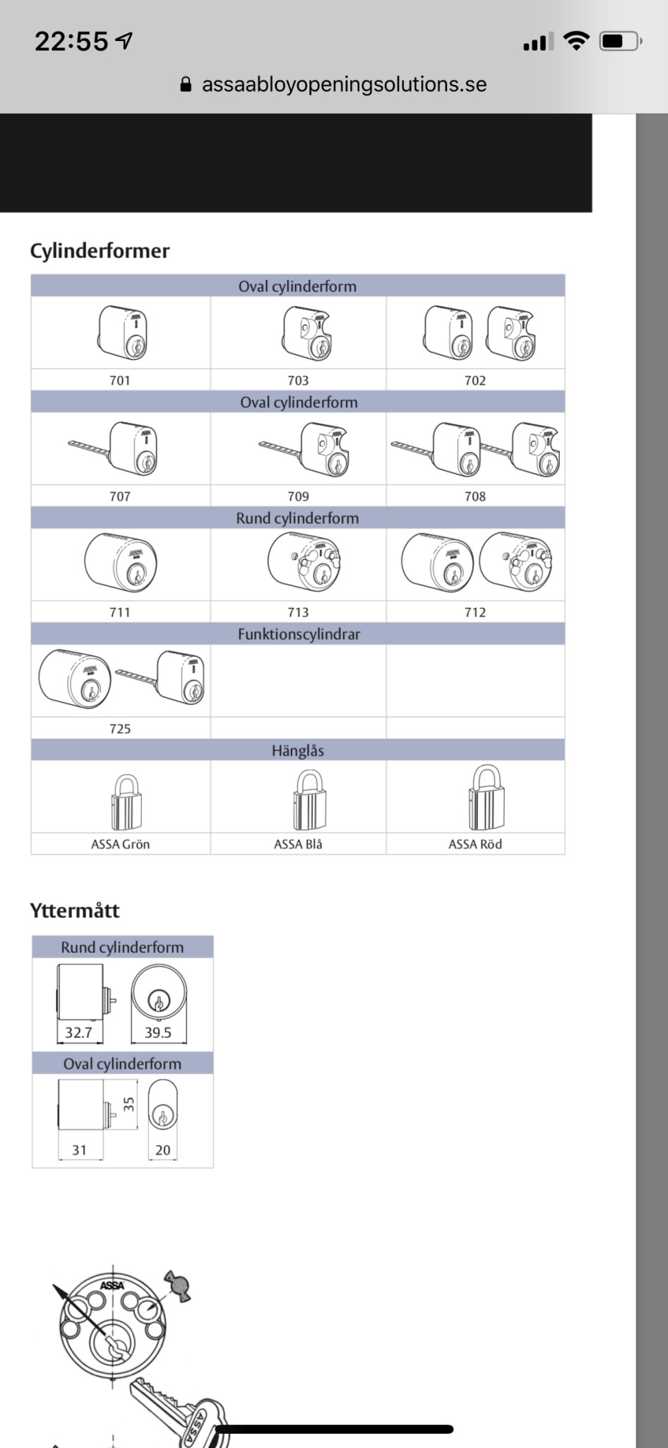 Ok, så det är skillnad på yttre och inre cylinder? Den som sitter där idag är oval.1 123abc skrev:Visst är det möjligt att göra så men jag rekommenderar att du istället kompletterar med en inside låscylinder (t.ex 703), en cylinderförlängare om så krävs, cylinderskruv samt en cylinderring för insidan.