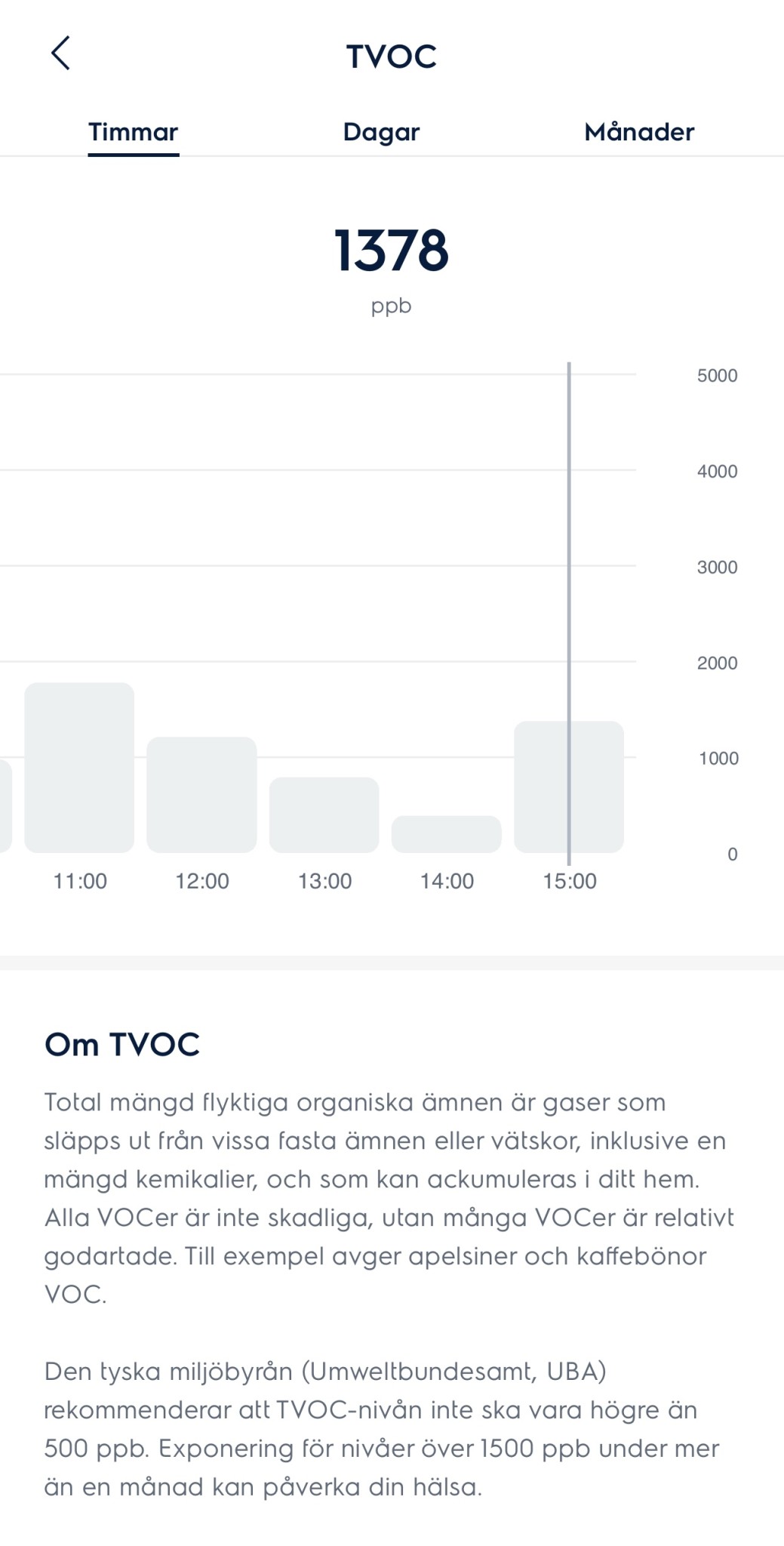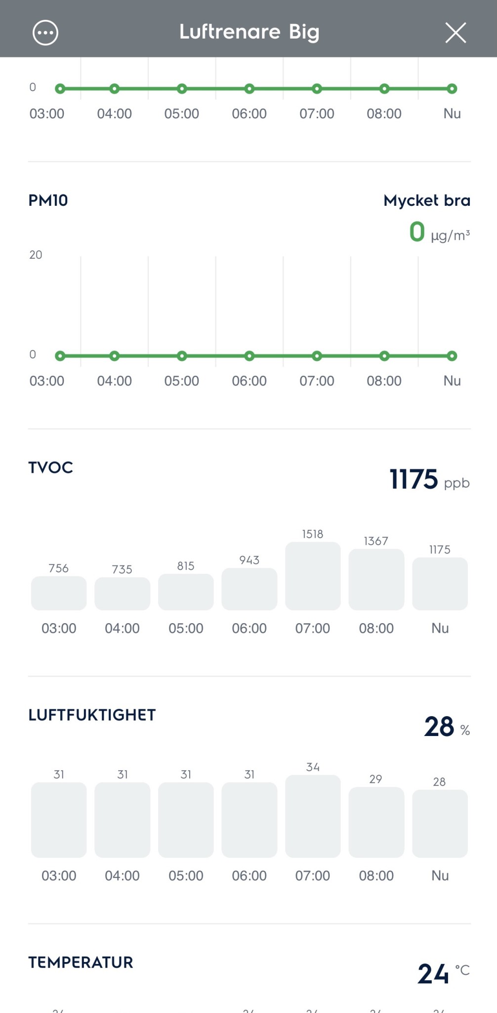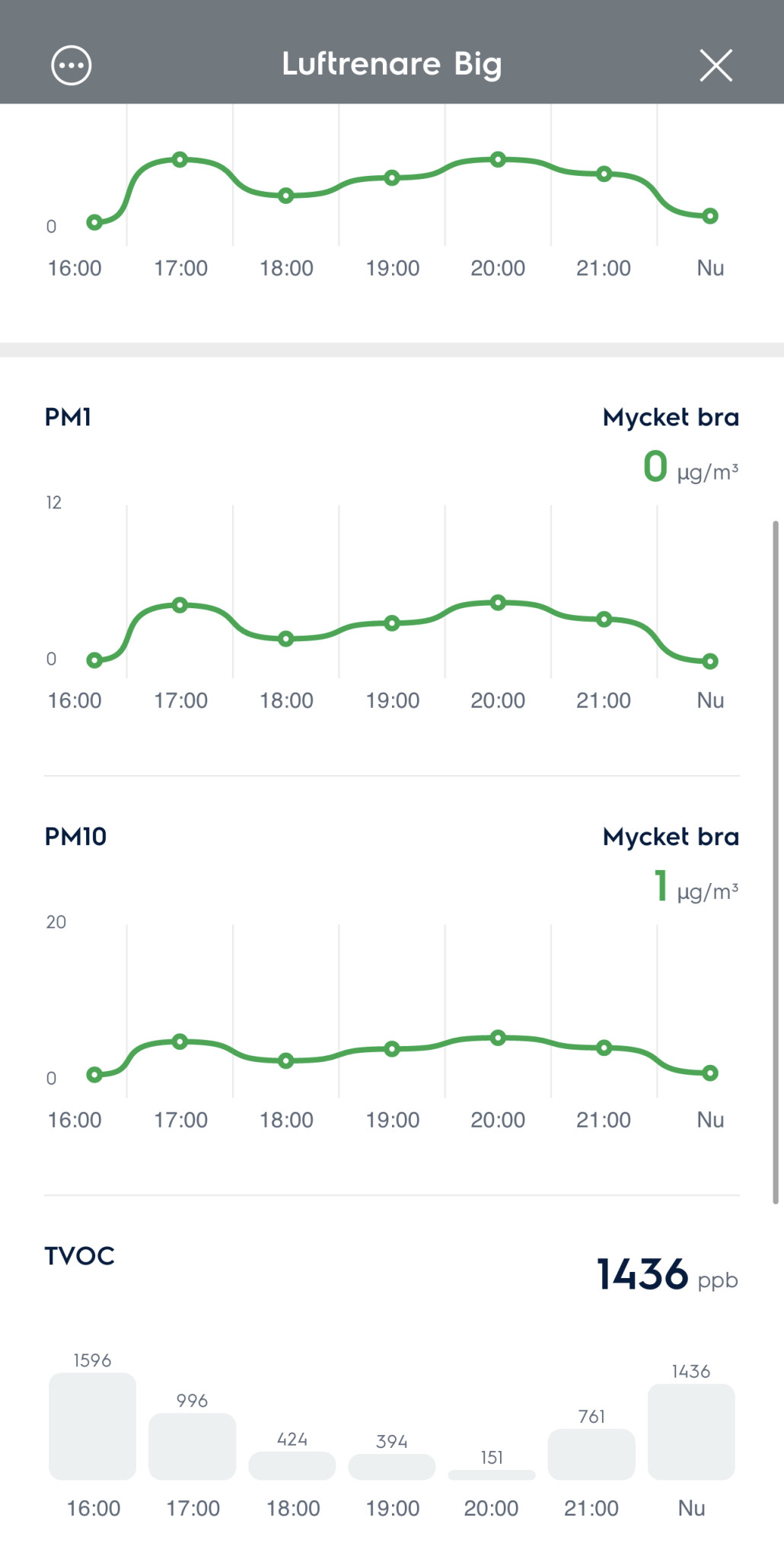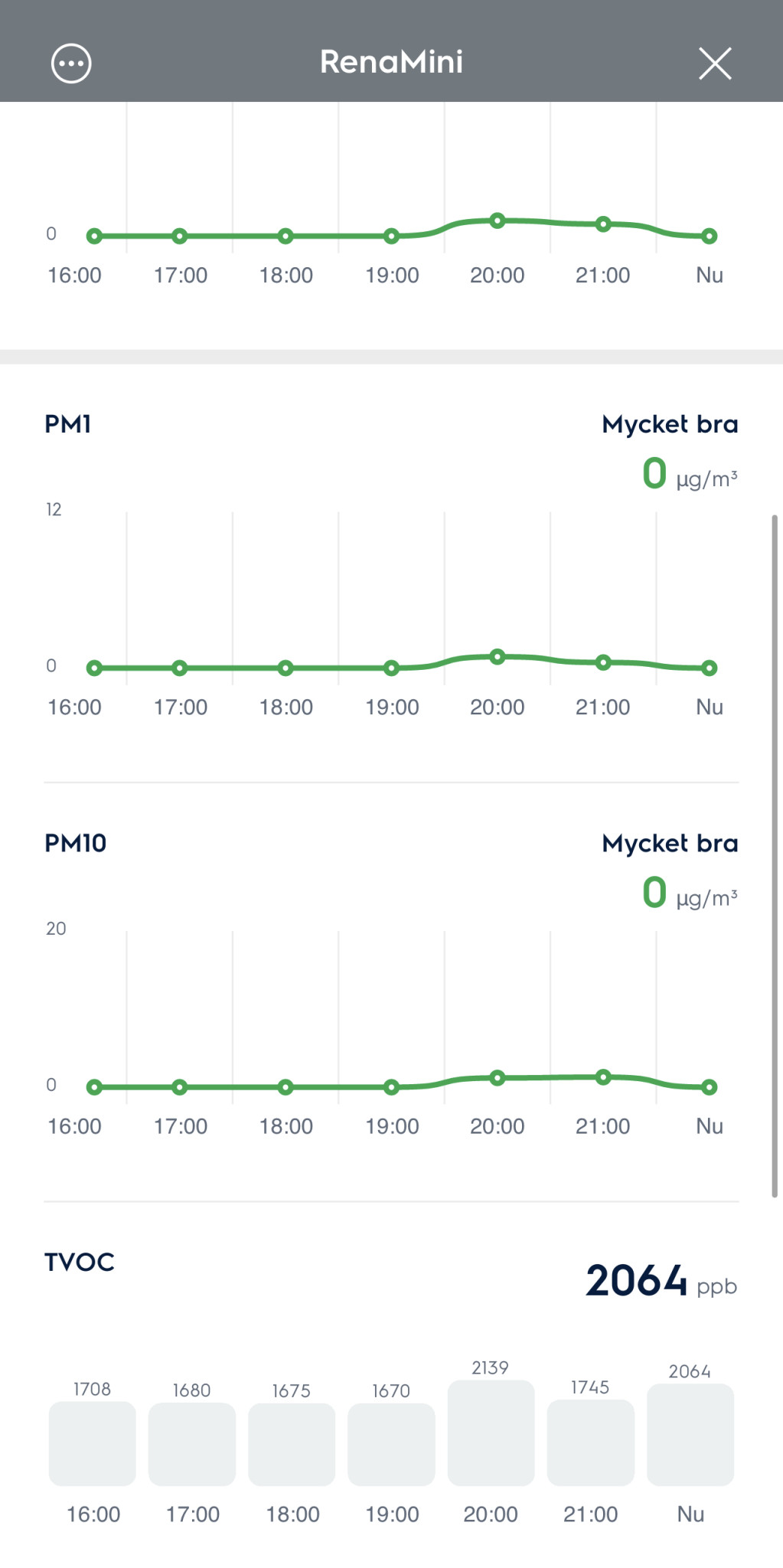 De höga värdena är när jag stängt fönstrena och balkongdörren. Ventilationen i lägenheten är igång 24/7.
