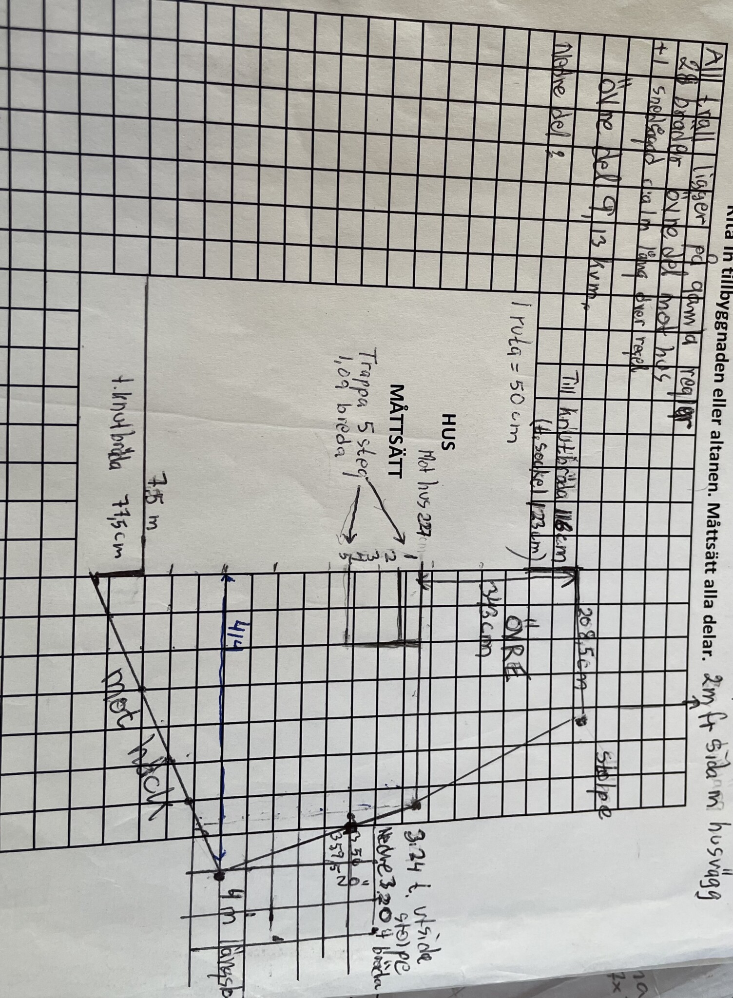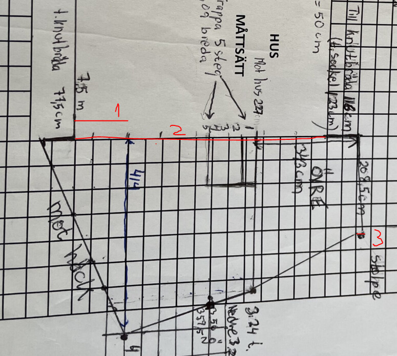 Tack så mycket! 🙏🏻 Mått 1 och 2 har jag. Det rutiga är 50x50 cm. Det jag missat var att mäta den sneda högra delen. Den behöver jag ju för att kunna räkna ut arean på rätvinklig triangel.K Kane skrev: