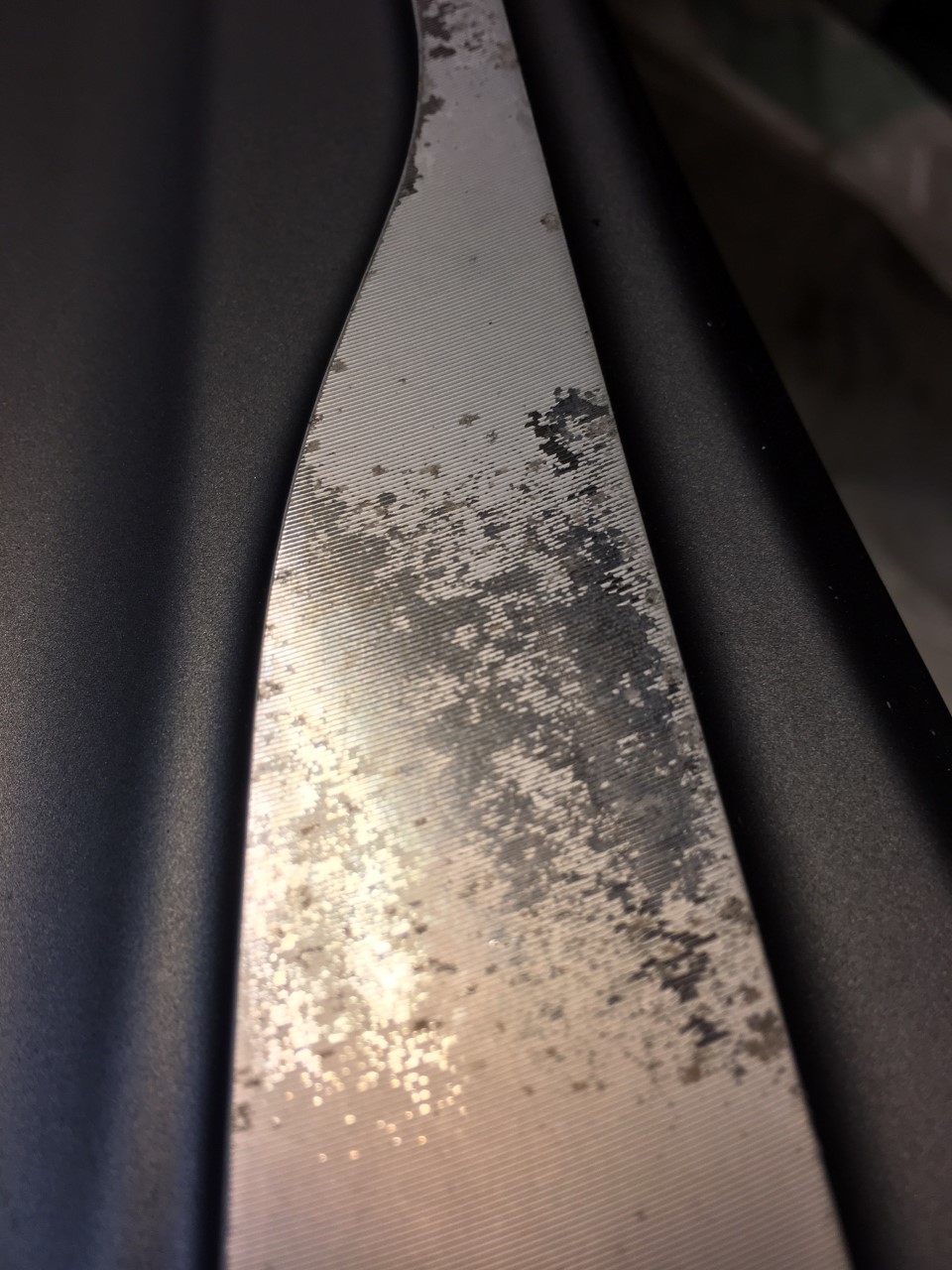 Trådskaparens skada ser ut att bara vara klarlack på aluminium som släppt och det kan vara svårt att återställa utan maskiner, så det enklaste är nog att grunda och på med täckfärg i silver eller svart.