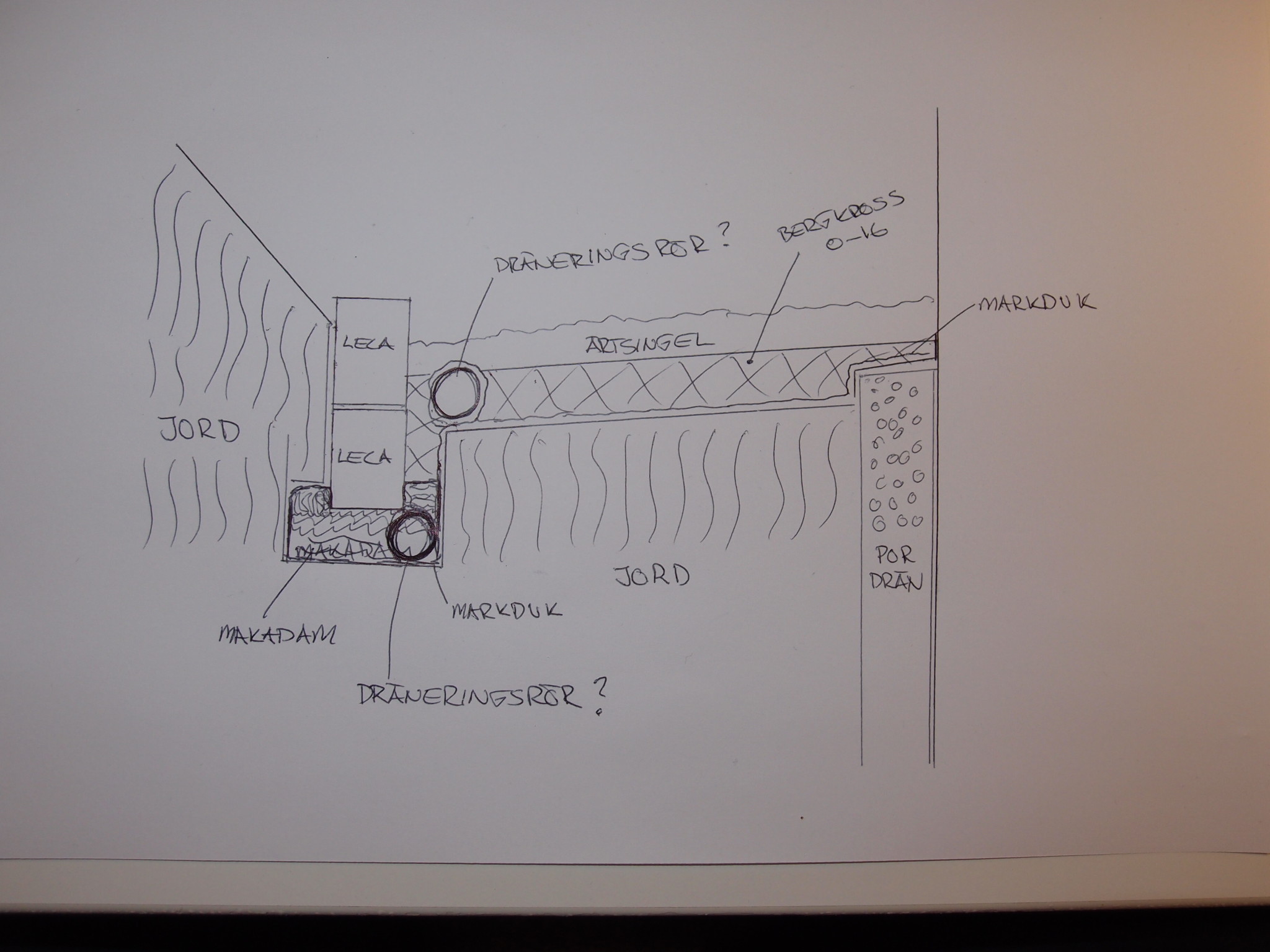 - Som framgår av bilden är det en slänt bredvid gången och det behövs nån form av dränering för att få bort vattnet som rinner från hussida och slänt vid kraftigare regn. Hade från början tänkt placera dräneringen på det övre läget i bilden men funderar på om den lägre placeringen blir bättre? Om jag använder den lägre placeringen kommer då vattnet ta sig igenom bergkrossen tillräckligt bra?