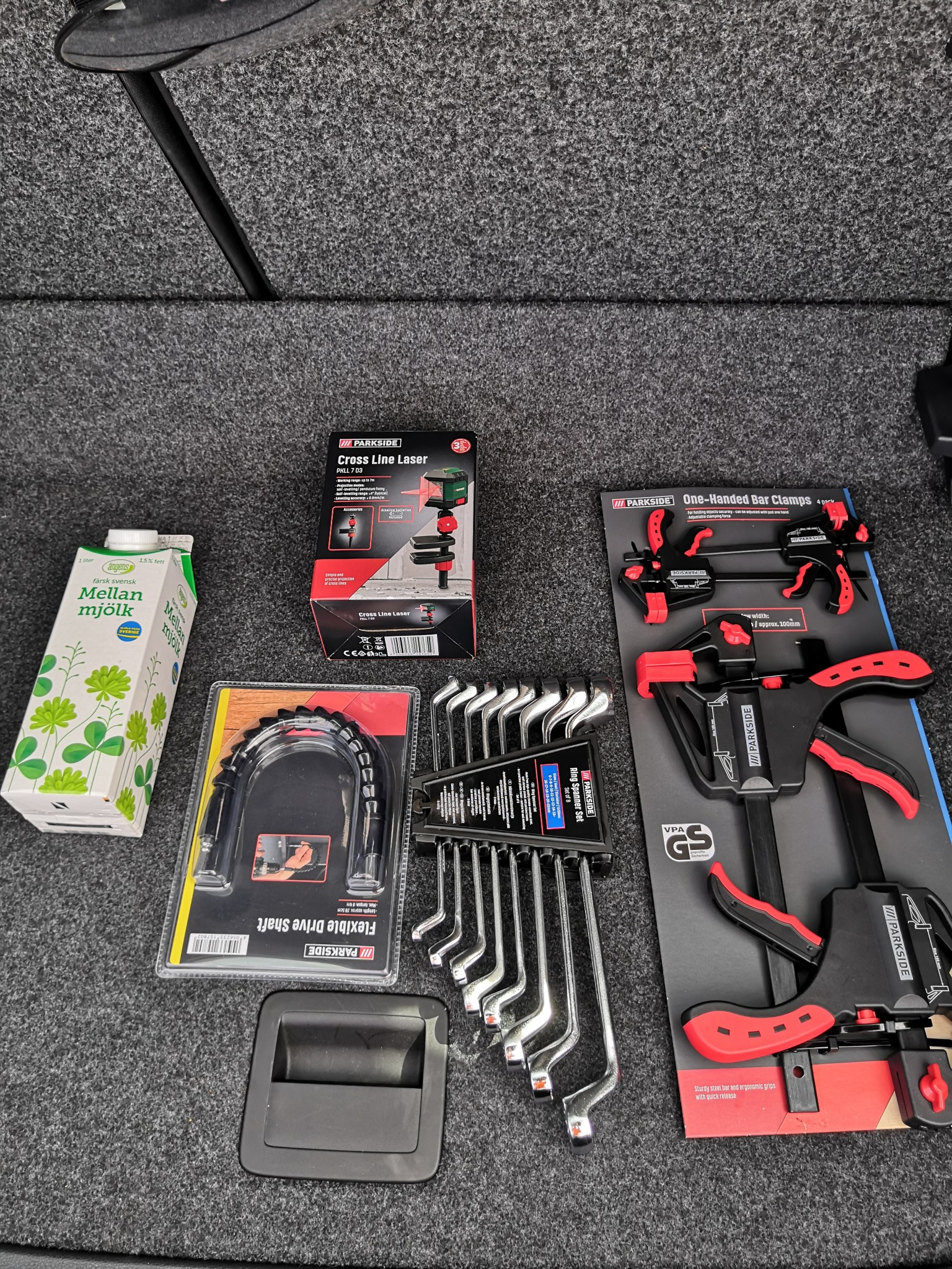 Sällar mig också till skaran som knep en laser, den näst sista i den andra butiken jag besökte! I den första butiken fanns det gott om sågar och bänkborrmaskiner kvar dock. Köpte även lite sticksågsblad, återstår att se kvalitén..