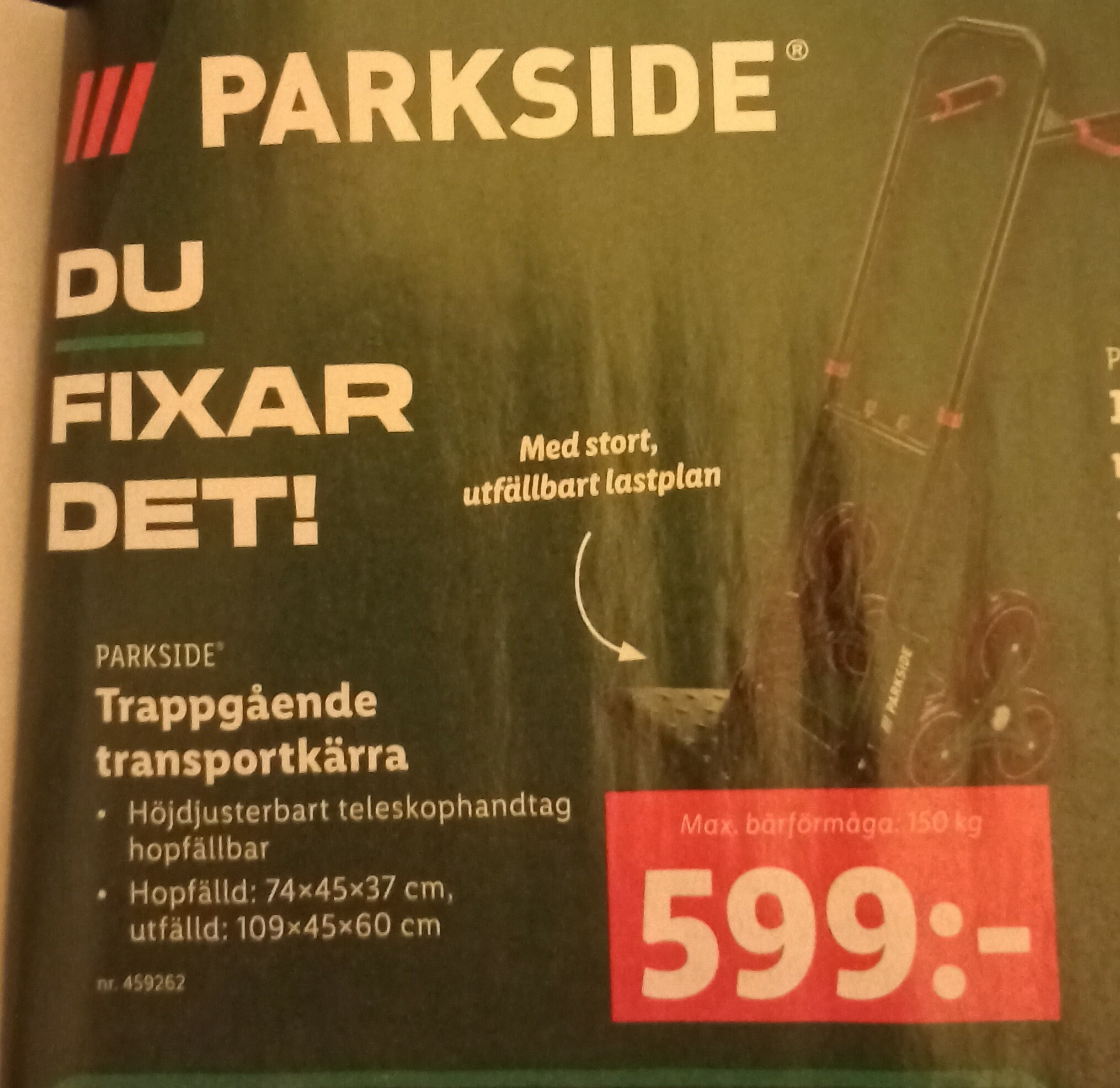 Det ligger definitivt något i vad dum säger. Jag köpte den icke trappgående varianten av den där för något år sedan eftersom det var söndag och jag desperat behövde en "pirra" för att flytta ett kylskåp och Biltema hade slut på sina. Den gick sönder direkt när jag satte foten mot nedre staget för att tippa den bakåt. Jag har svetsat ihop den och använder den numera till enklare lyft.A Anders_Nilsson skrev: