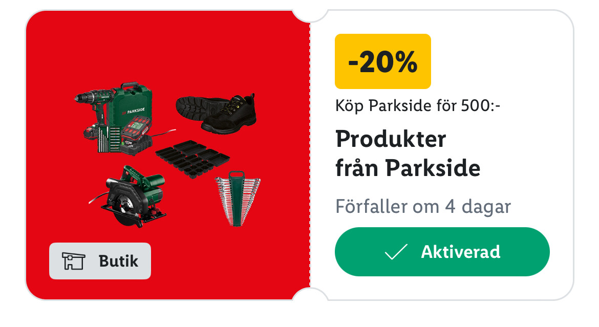 Ja, det är viss oklarhet om kupongerna - det tydliga "20 % på Parkside", det mindre tydliga - se specifika produktkoder (i en lång lista). Rimligare borde vara gäller allt utom veckans kampanjvaror om det är vad de vill uppnå.V Vardagsrum skrev:Hur menar du, att du lyckades få rabatt eller att du lyckades köpa tre saker utan rabatt? Rekommenderar dig att kontakta kundtjänst om det nu var så att du inte fick den utlovade rabatten.