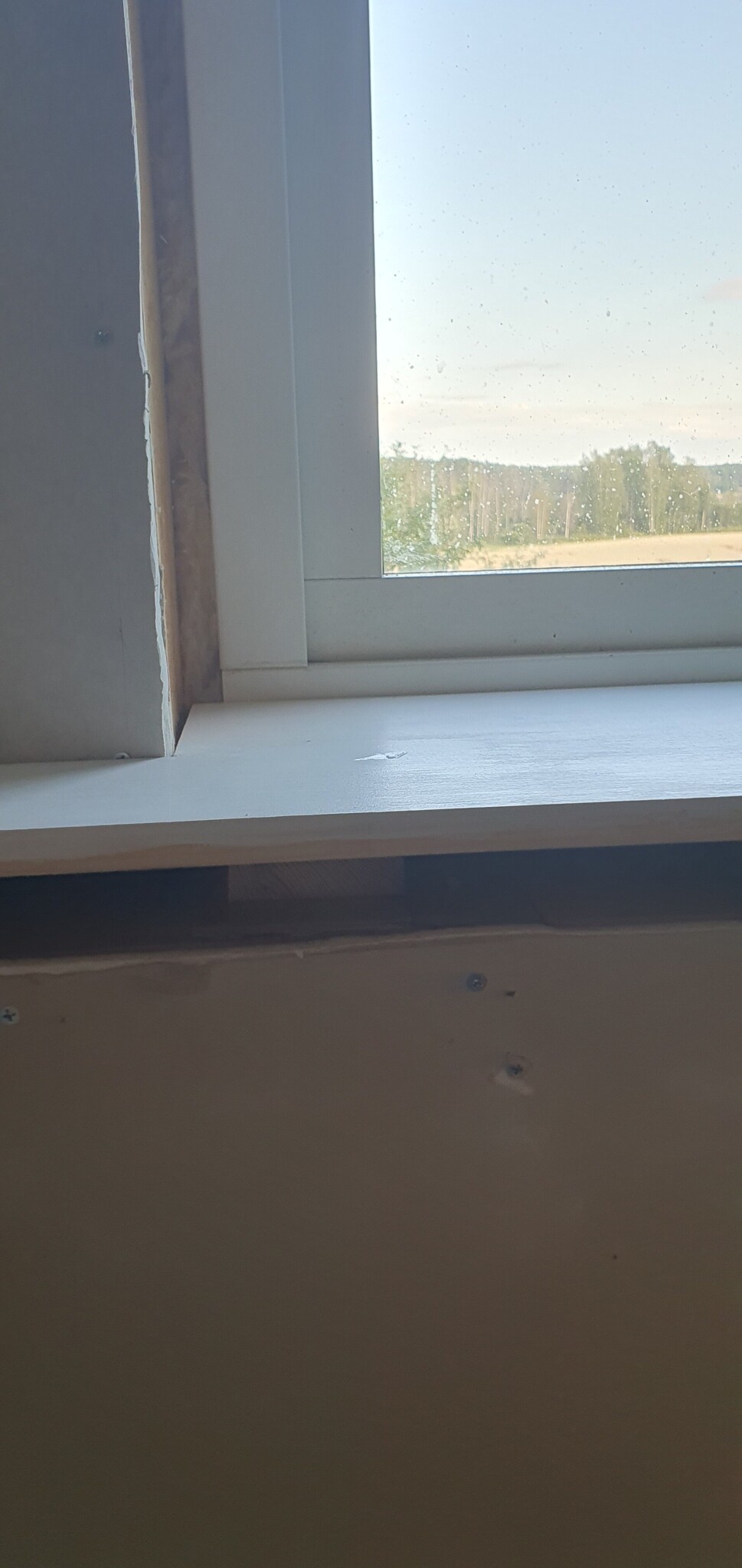 Ja syns lite dåligt på bilden, kanske lättare förstå här, men eftersom karmen går ut längs med väggen så var det ett himla jobb få hörnen synka så brädan gick tätt mot karmen, nu är det nästan 100% men som sagt nån millimeter glipa i ena änden. Hoppas det mesta försvinner när sidostyckena kommer upp men räknar med att behöva lägga nån mjukfog ändå.J jonaserik skrev:Vad menar du inte dikt, är det mot fönsterkarmen du menar då, blir till att justera/fila/putsa. Men pass på, lätt att det blir någon tiondel och glipan är ett faktum. ( målarrfog kan det bli ) Brädan ser ut att gå förbi som en liten läpp på den del som är vägg. Mina brädor ligger exakt mot fönsterkarmen.