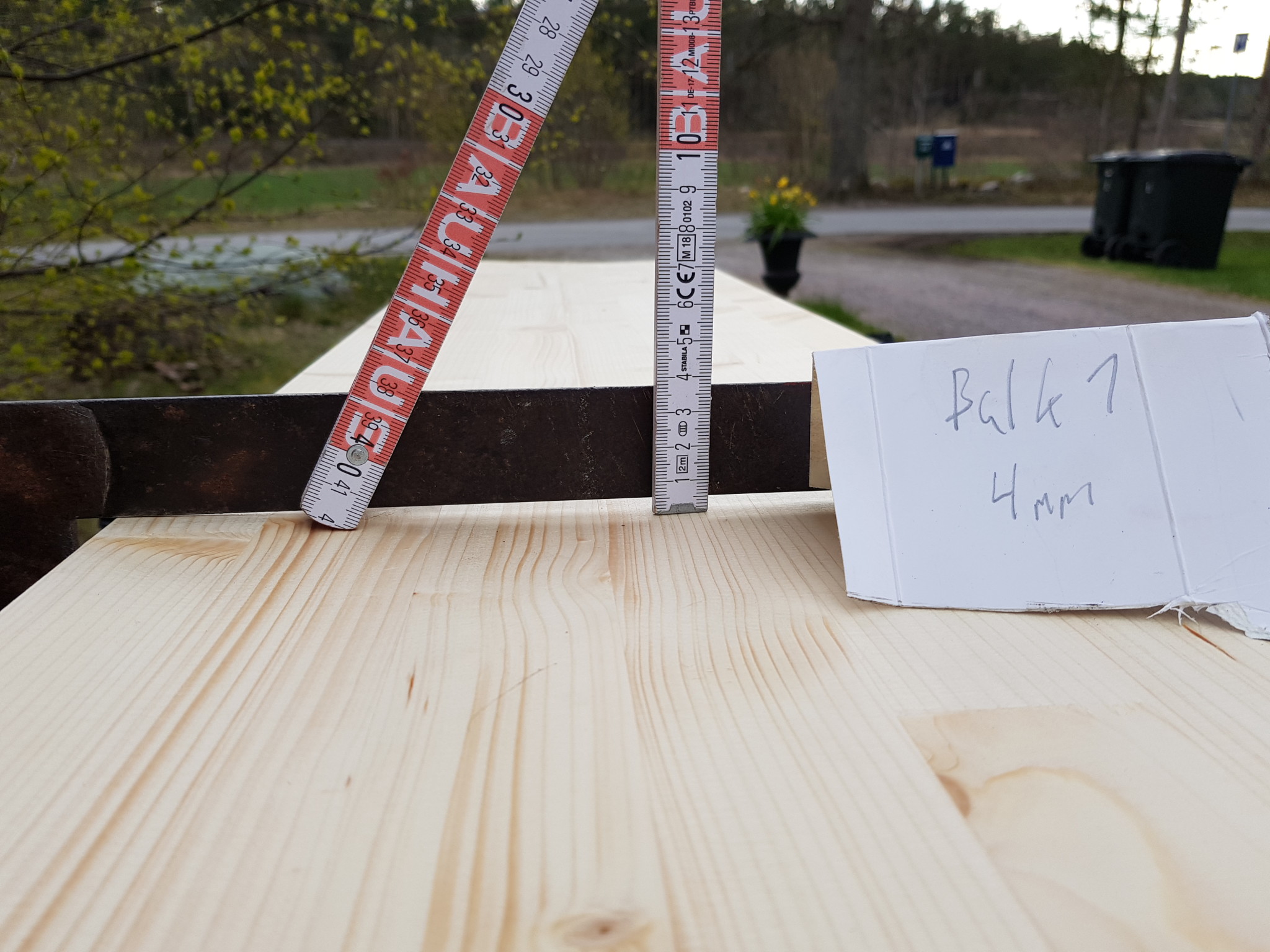 Dom andra tre balkarna är i gränslandet vad som vill acceptera. Syns tydligt på bilderna att de inte förvarats optimalt. Och samtliga balkar ser ut som ett U med ca 4 - 5 mm "nedbuktning". Se bild.