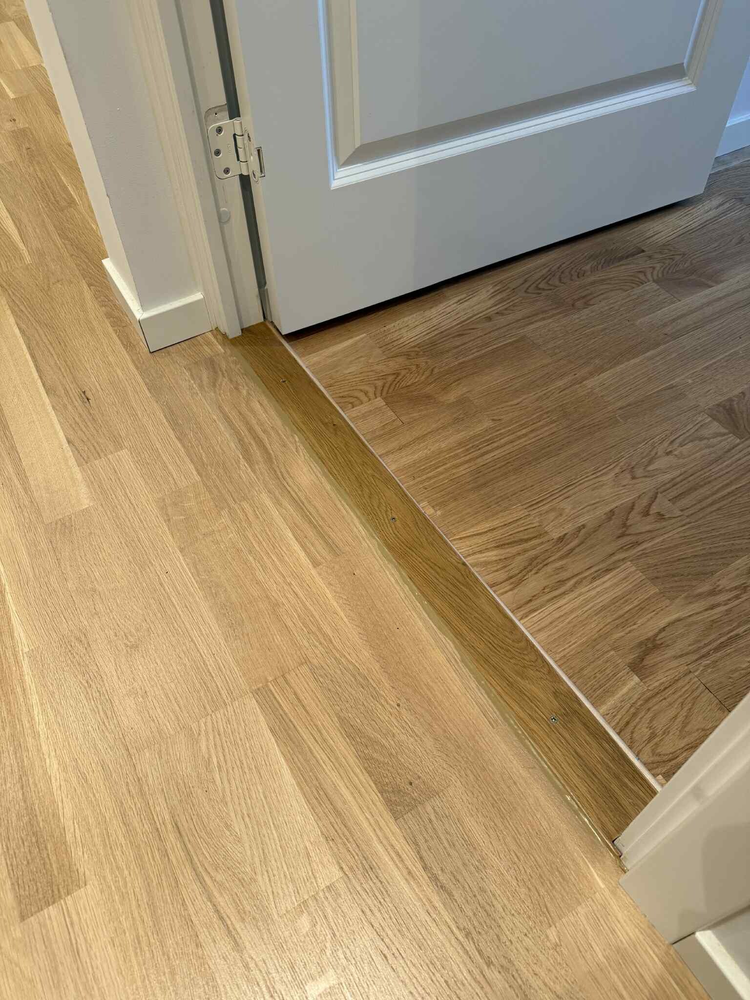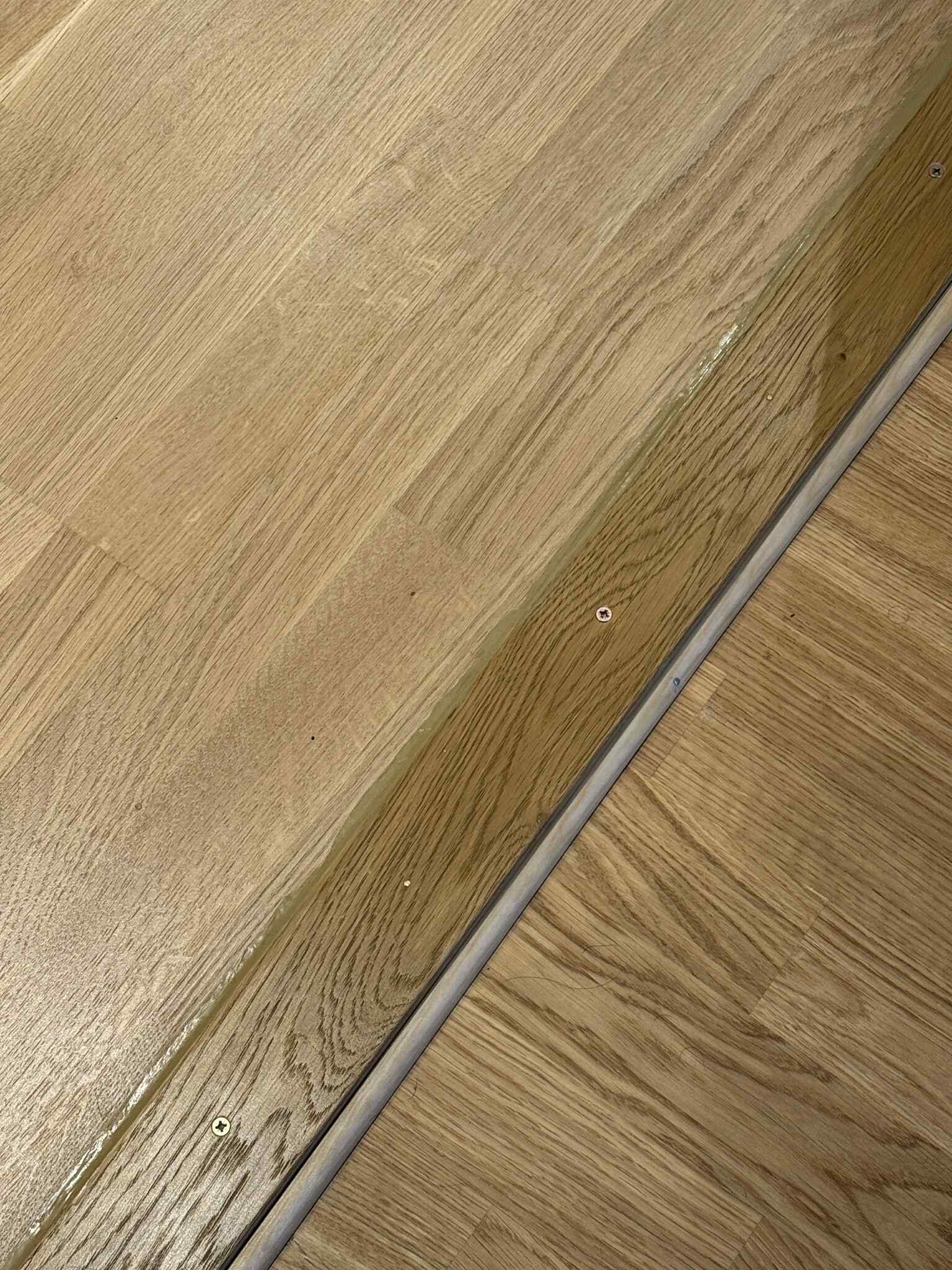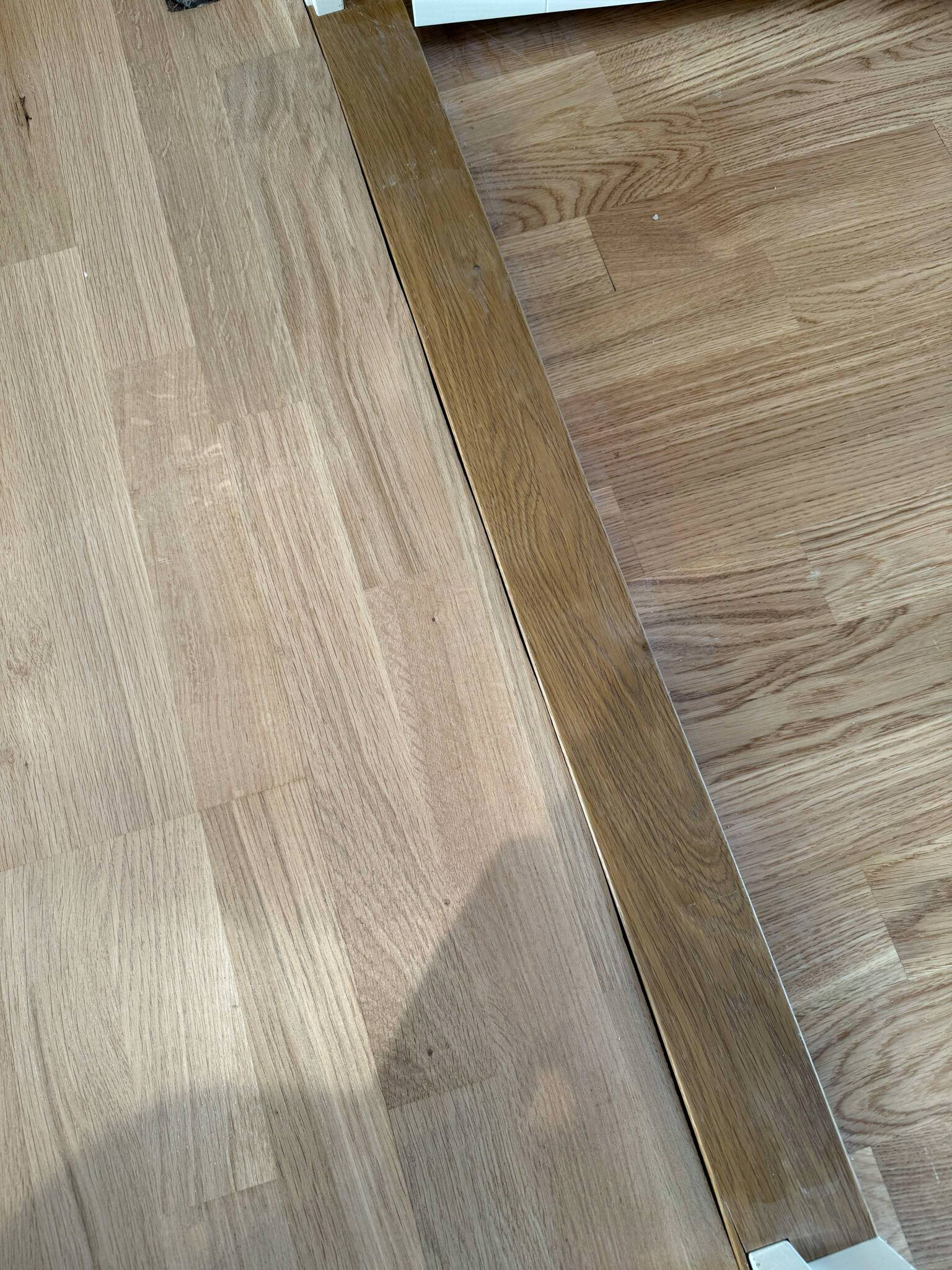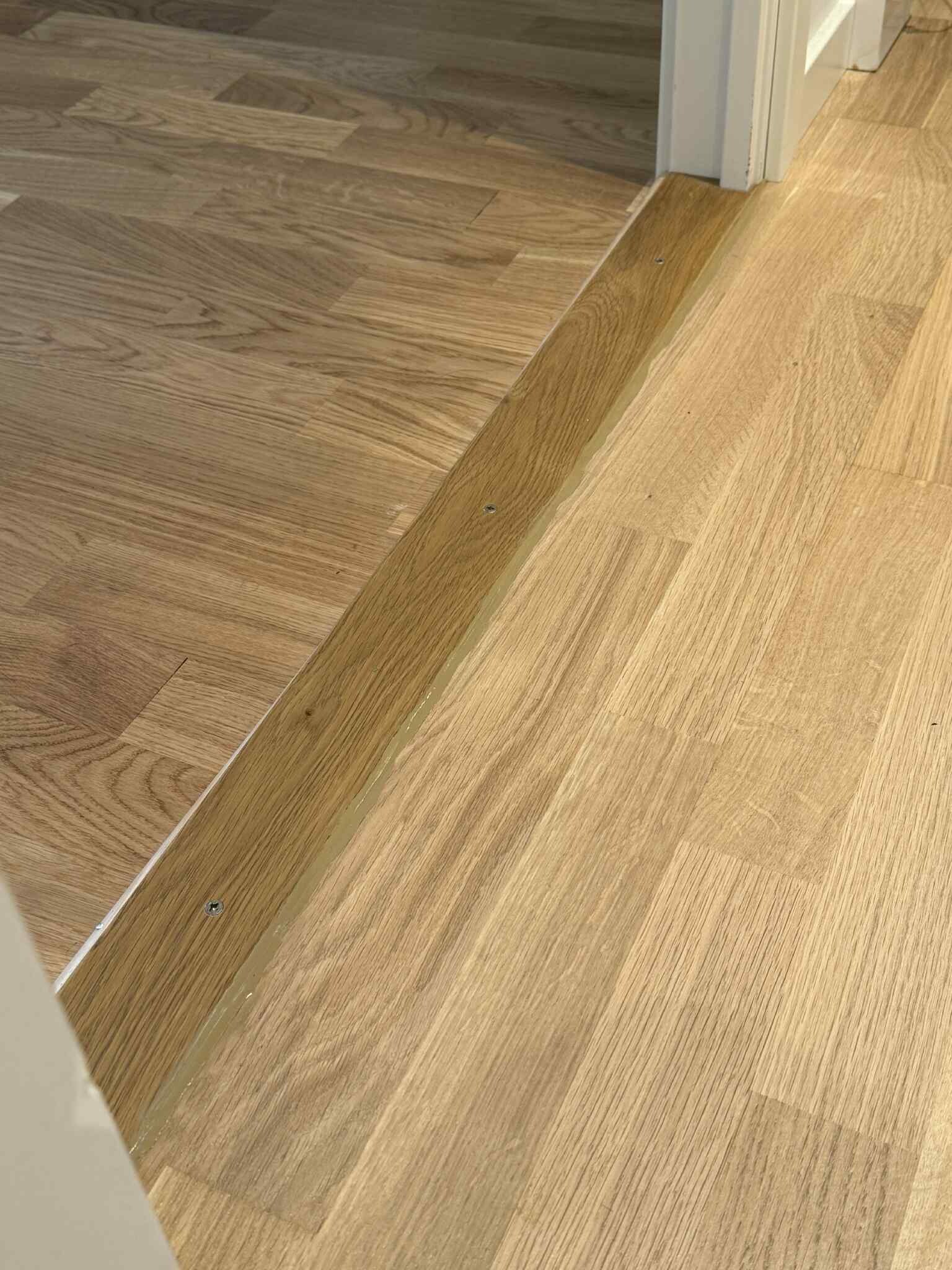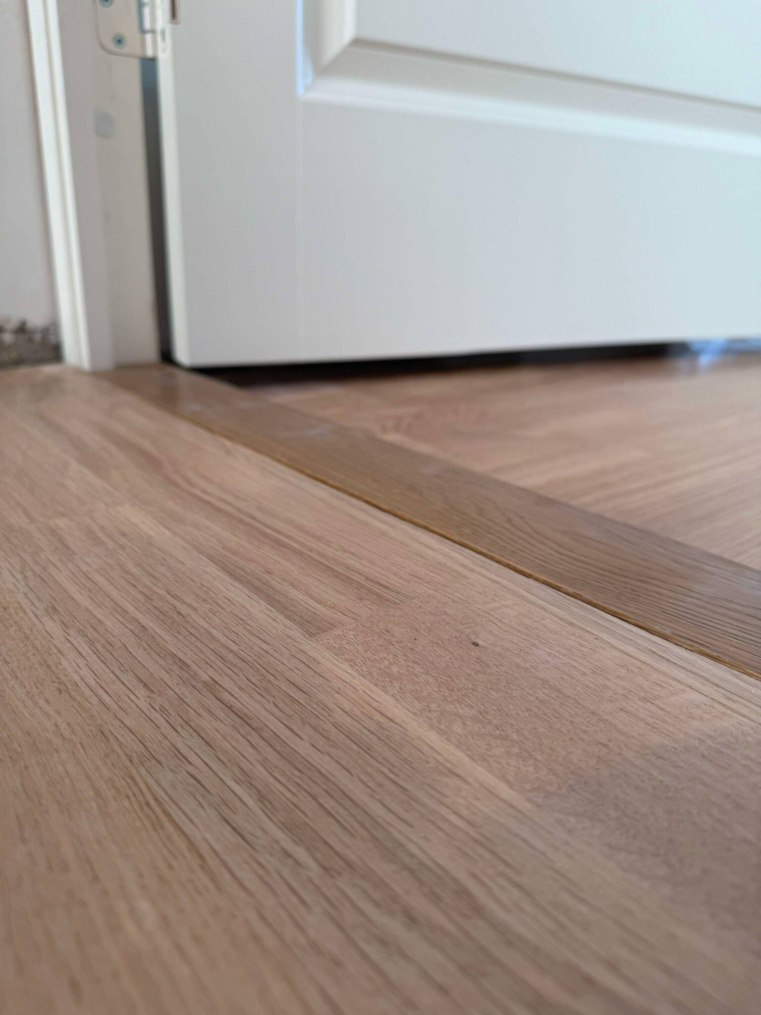 Hej! Vi har monterat en ny dörrkarm och den nya karmens tröskel hamnade i samma höjd som ett av rummens golv. I vanliga fall kan man sätta kvartslister mellan höjdskillnader men vad kan man göra i detta fallet? Jag tycker det är snyggt att de är i samma höjd men det blev inte så snyggt eftersom parketten inte är perfekt rakt så man ser springan mellan tröskeln och parketten.