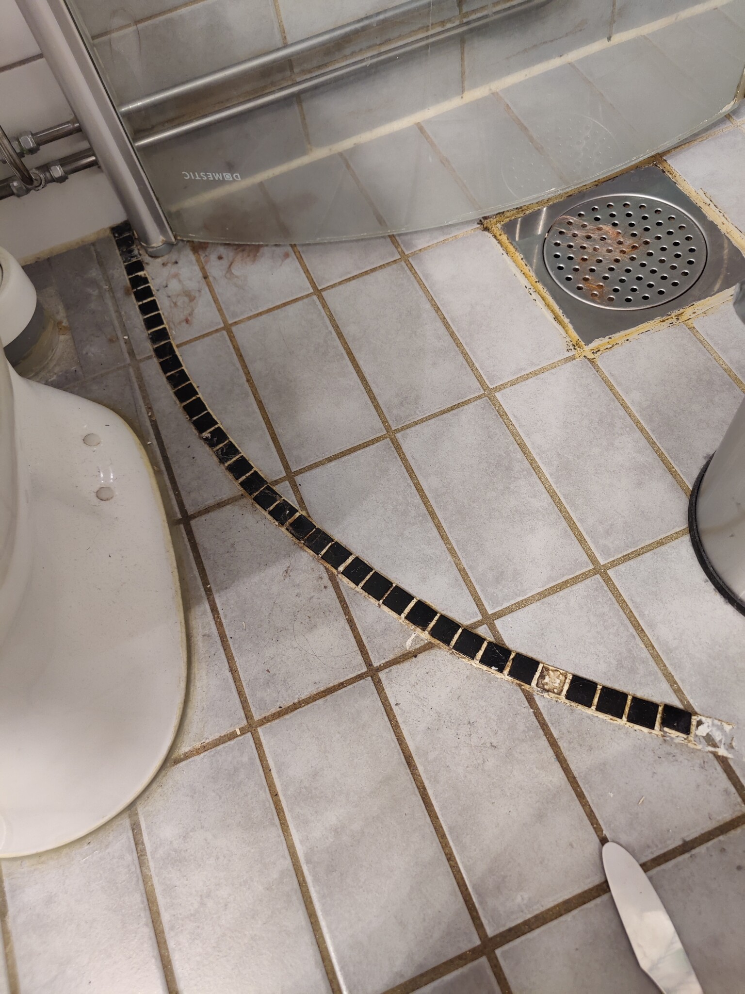 Jag har nyligen köpt en lägenhet och i duschen fanns en liten "mosaik-list" för att hindra vattnet från att rinna ut ur duschen. Jag gillar idén men tyvärr var det dåligt utfört och såg väldigt fult ut (några mosaikbitar hade trillat bort), så jag tog bort det och tänkte försöka göra om det.