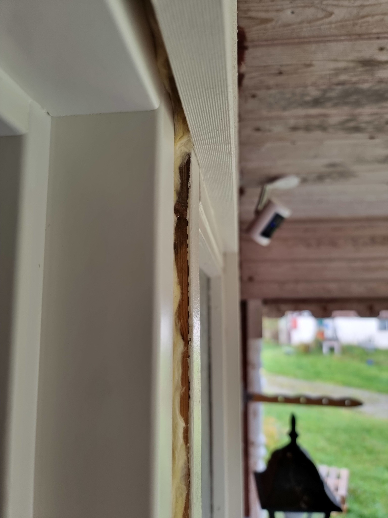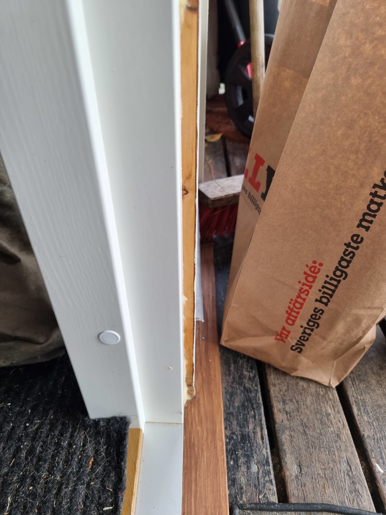Antingen så sätter du fodret så det följer sidofönstrets lutning och sågar en sned smyg för utrymmet som bildas vid dörrkarmen. Eller så sätter du en smyg som bygger lika mkt som där det sticker ut som mest på dörrkarmsidan och sedan sågar en sned smyg på sidofönstret, då sitter fodret i lod mot dörren.Robin Å skrev: