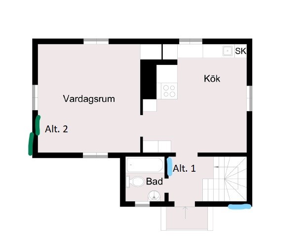 Vi har ett fritidshus utanför Stockholm där vi vistas året om. Huset är i två våningar och har en relativt stängd planlösning. Takhöjden är för låg för att kunna placera innerdelen över ytterdörren. Vi har valt en golvstående modell och tittat på två olika alternativ för placering. I alternativ 1 i hallen bör vi få en relativt bra spridning i huset och minimera de störande ljuden. Installatören jag talat med vill dock inte sätta på en innervägg då det krävs en lutning på det anslutande röret för att bli av med vattnet. I alternativ 2 placerar vi innerdelen i vardagsrummet, där blir anslutningen enkel men ljudet störande och spridningen sämre, där har vi dessutom en kamin men det kanske kan vara bra också om vi fjärrstyr och sätter igång värmen innan vi kommer fram...