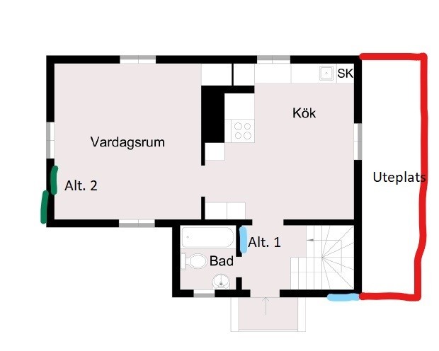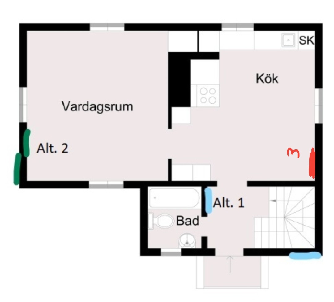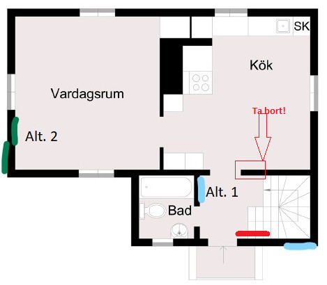 Sätter du innedelen enligt alternativ 1 så kan man dra kondensslangen direkt genom väggen in i badrummet.M MyG skrev: