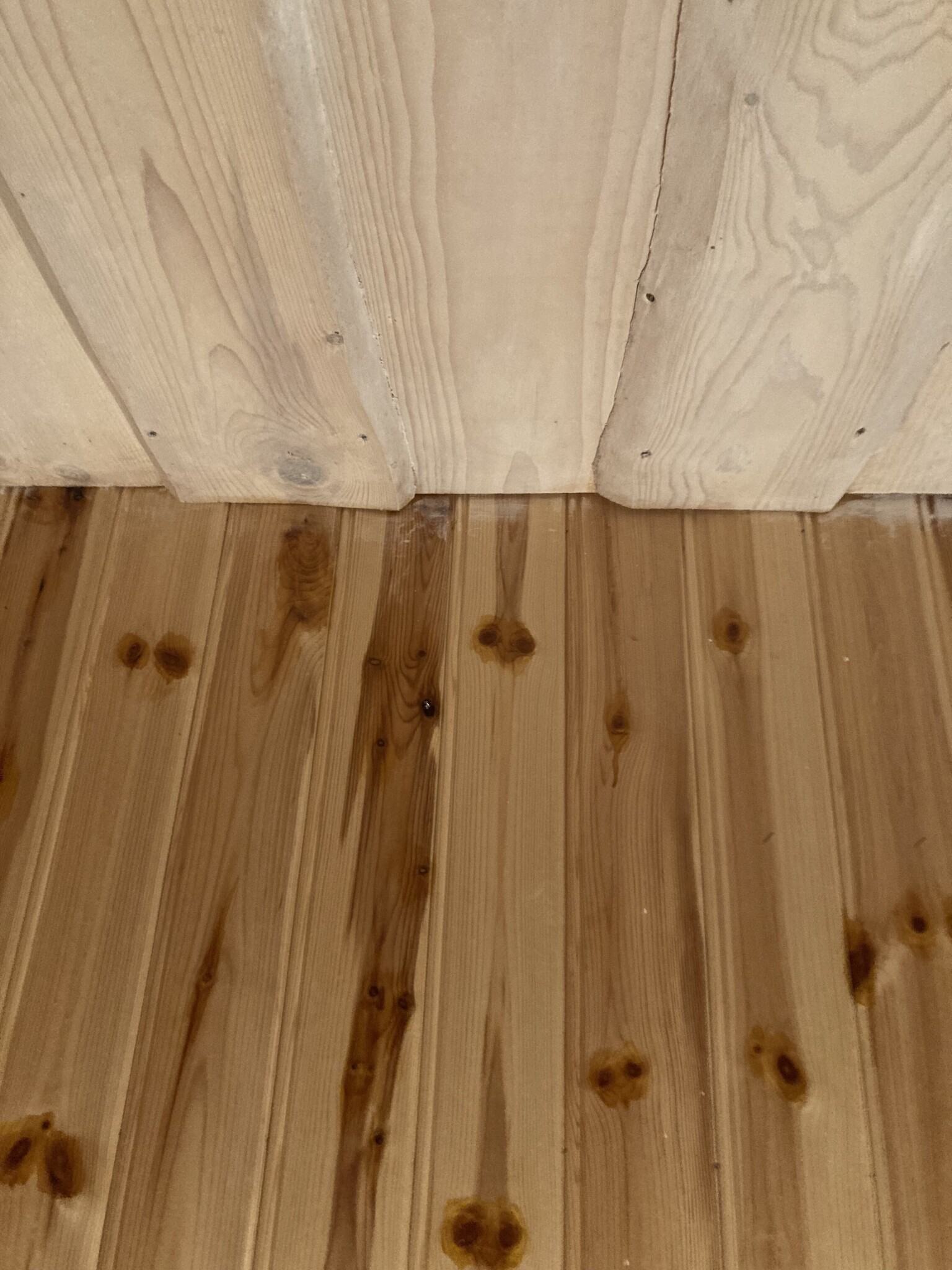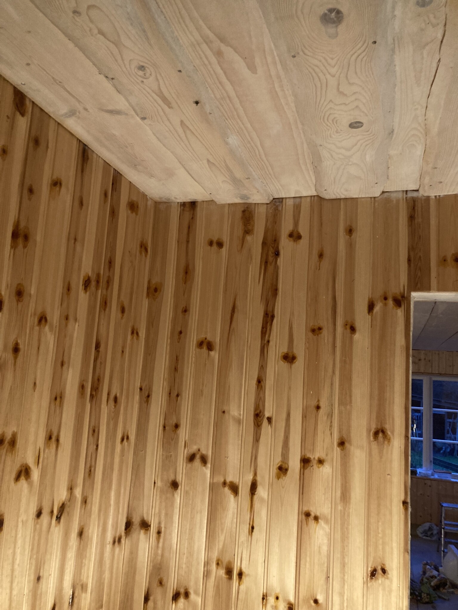 Det är pärlspont på väggen, ännu bara kvistlackad. Tacksam för förslag på lösningar.
