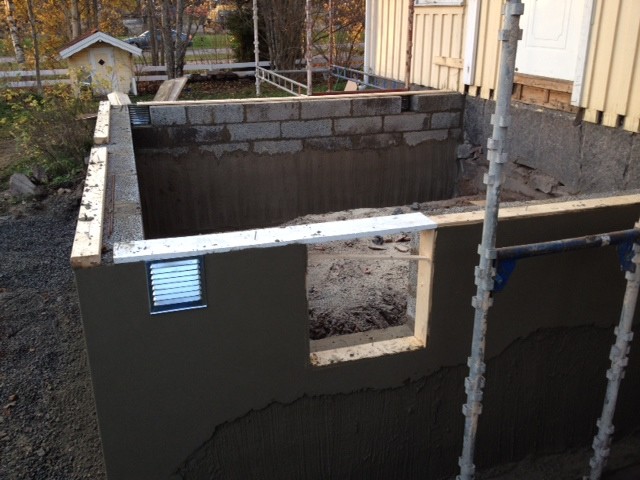 Bygger ut huset (torpargrund, 1930) och vill passa på att få till en liten matkällare som man kommer åt genom golvlucka. Tänker alltså inte gå ned i den utan hissa upp hinkar eller liknande förvaring. Planen är att mura med enkelt lager lecablock, ca 60x100 cm bottenarea, på marken nära ytterdörren i bilden, nära, eller mot, bef husgrund. Det är nu ca 1,20 m fr befintlig mark till golvnivån i nya rummet. Matkällaren kommer ju ligga skyddad av själva grunden som visas på bilden. Ett litet ventilationshåll i nederkant och ett i överkant tänker jag, och så en golvluckan som är isolerad med frigolit el likn på undersidan. Tanken är att det ska vara frostfritt på vintern och max 13-14 grader på sommaren. Kommer det funka? Måste den täckas ut-eller invändigt? (Med vad?)
