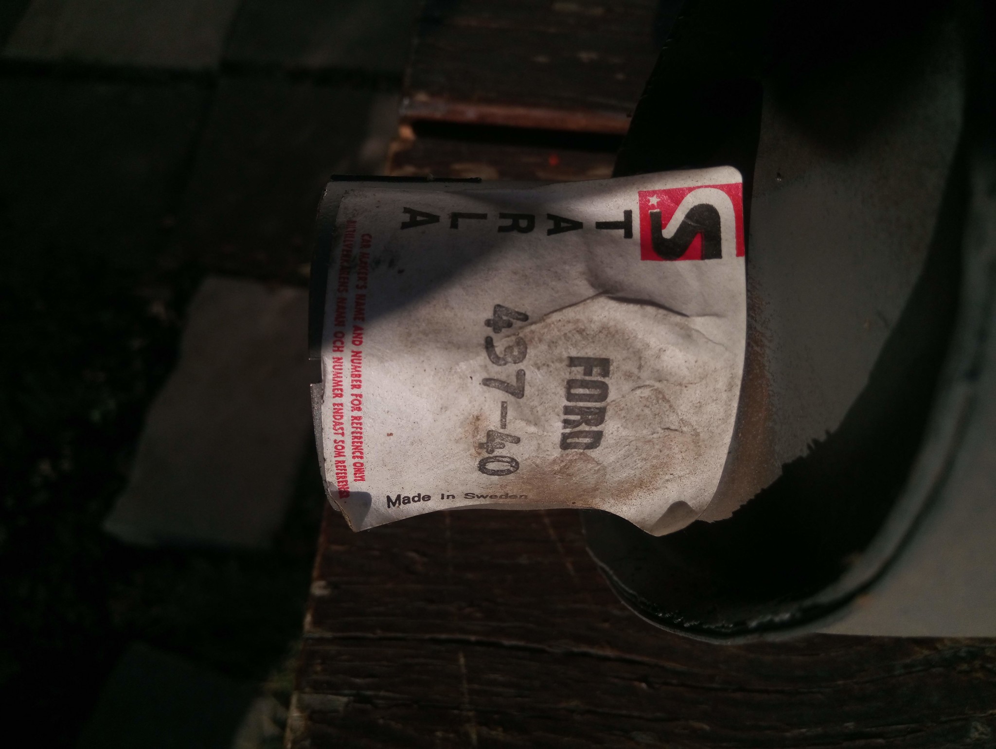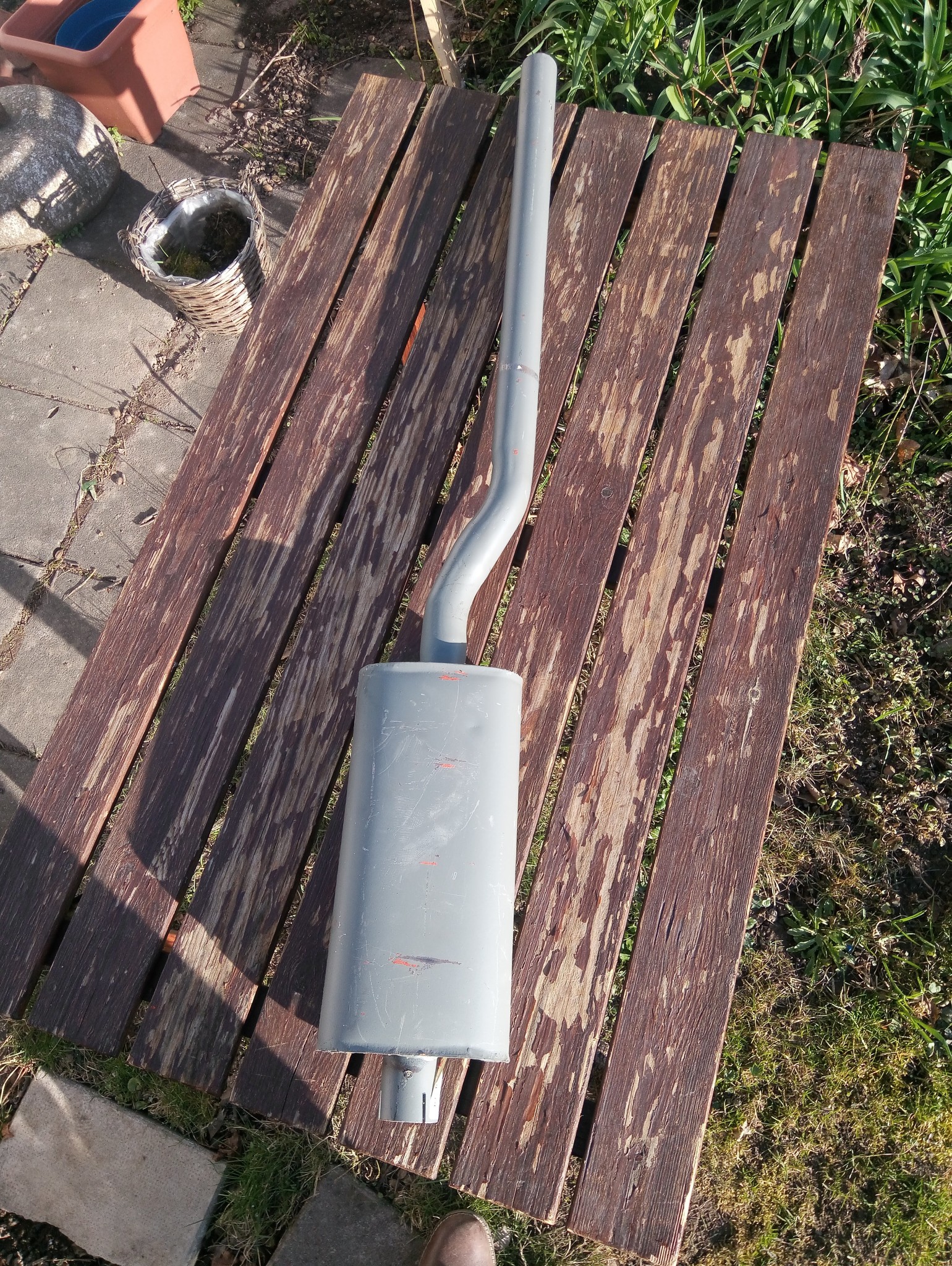 Fick med ett avgassystem/ljuddämpare till en Ford av äldre modell(?)när vi köpte hus. Låg i virkesupplaget i garaget. Ser helt oanvänd ut så den går ju att sätta upp på väggen som prydnad, eller om nån renoverar en gammal bil?