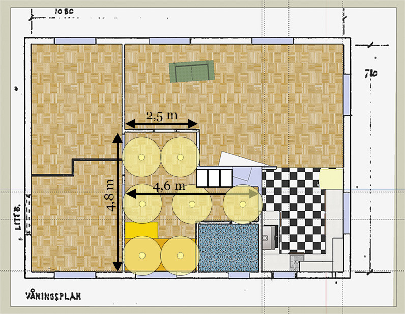 vi håller på att renovera vårt nya boende och har funderingar på downlights i övre hallen som nås via trappa. Vi har tittat på DOWNL LED 5W 3000K IP21, som har en spridningsvinkel på 30 grader. Med en takhöjd på ca 2.5m borde käglan ligga runt 1.40m och med det som bas skissade vi lite på utförande.