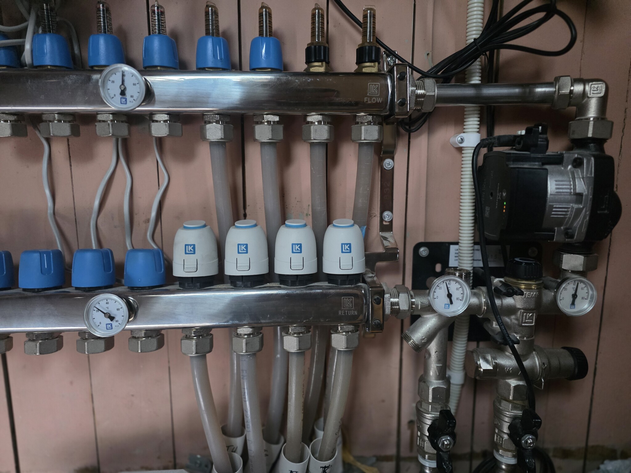 Termometern på övre fördelaren kommer att visa lite lägre temperatur än termometern innan cirkulationspumpen, detta pga att det inte är något flöde på vattnet förbi termometern å vänstra delen av fördelaren "kyler".