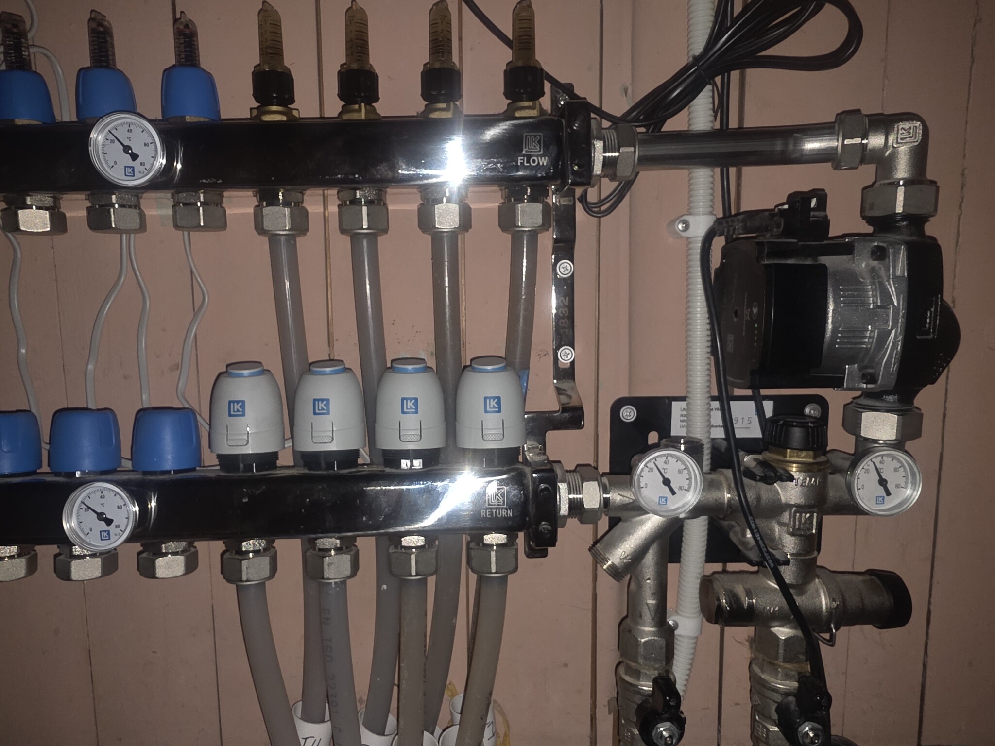 På bilden ser det ut som flödesmätarna är helt stängd. Då är det svårt å få värme. För att få bra värme så ska varje slinga justeras så det blir en skillnad på 3- 4° på tillopp å retur. 40 grader är mycket på golvvärme framförallt om det inte så kallt ute.