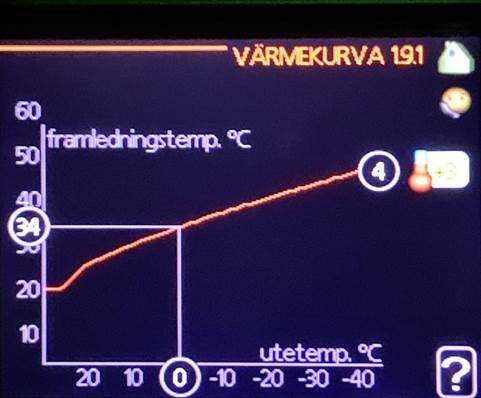 Framledningstemp är inställd på 34 grader och förskjutning (?) värde 4.