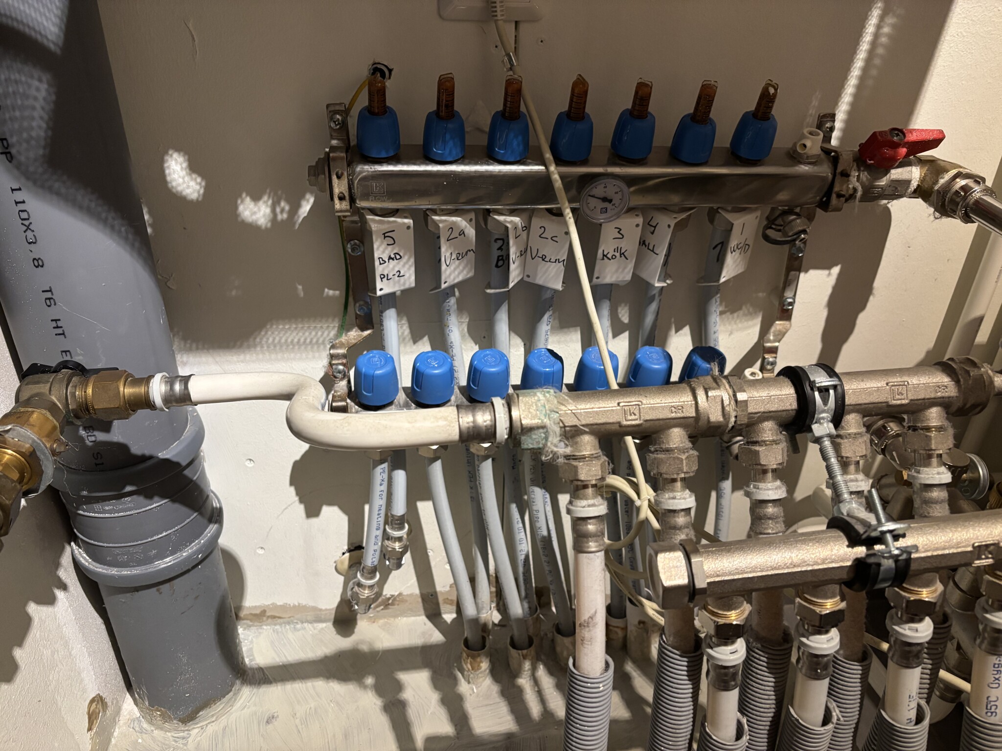 Syns det att det är flöde i mätaren ovanför, så stänger du med att vrida på den blå delen, tills markeringen är i topp. Sen skruvar du ner den blå nertill i botten, då ska det vara stängt mot bad-slingan