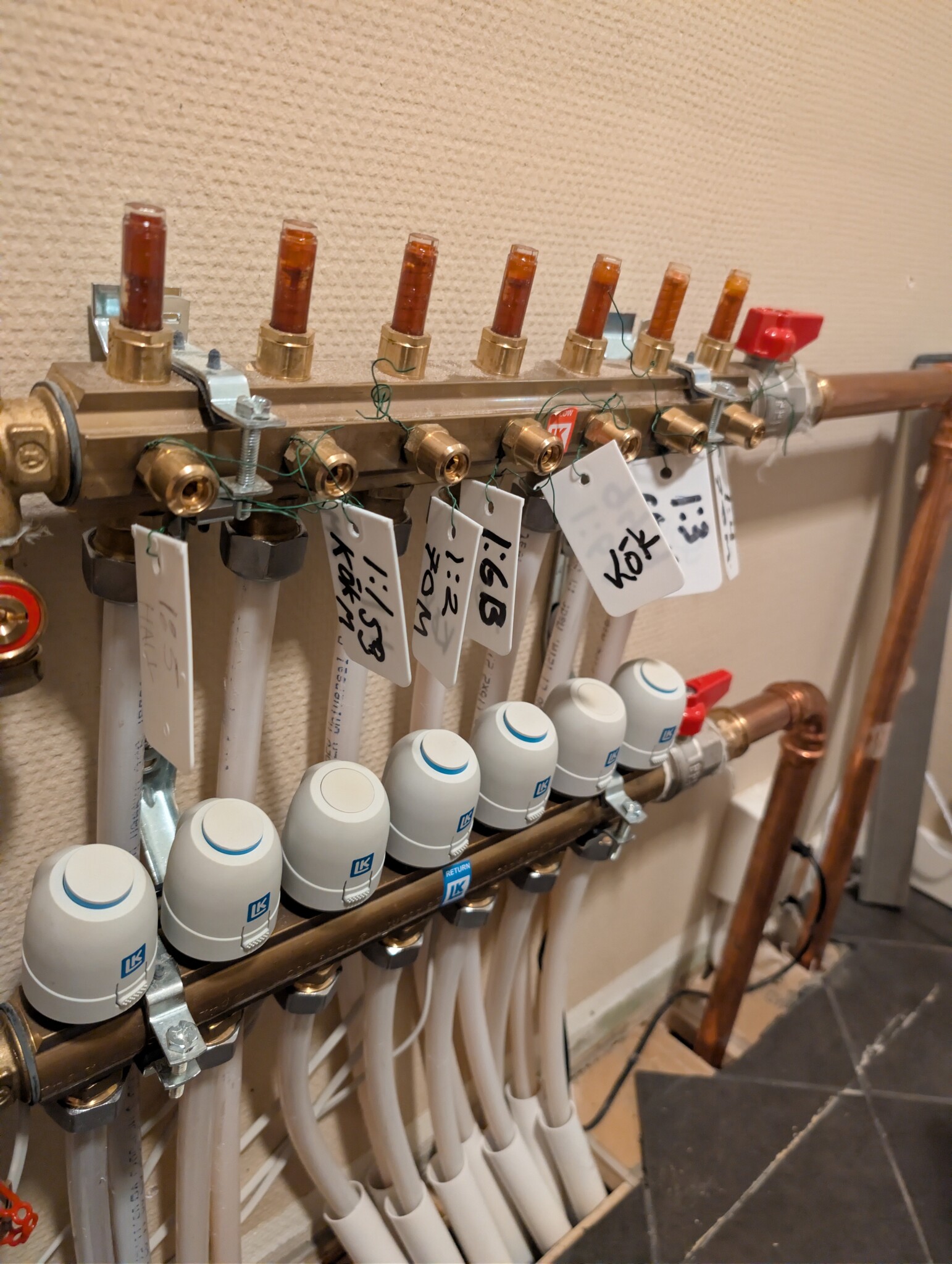 Har Lk systems vattenburen golvvärme och upplever vissa slingor kalla. Enligt bild så verkar två ställdon vara stängda. Går det att kontrollera dom på något sätt? Har plockat bort dom och piggen går att trycka ner. På den fjärde från vänster är den helt stum. Går det att få "liv" i den, eller är det byte som gäller?.