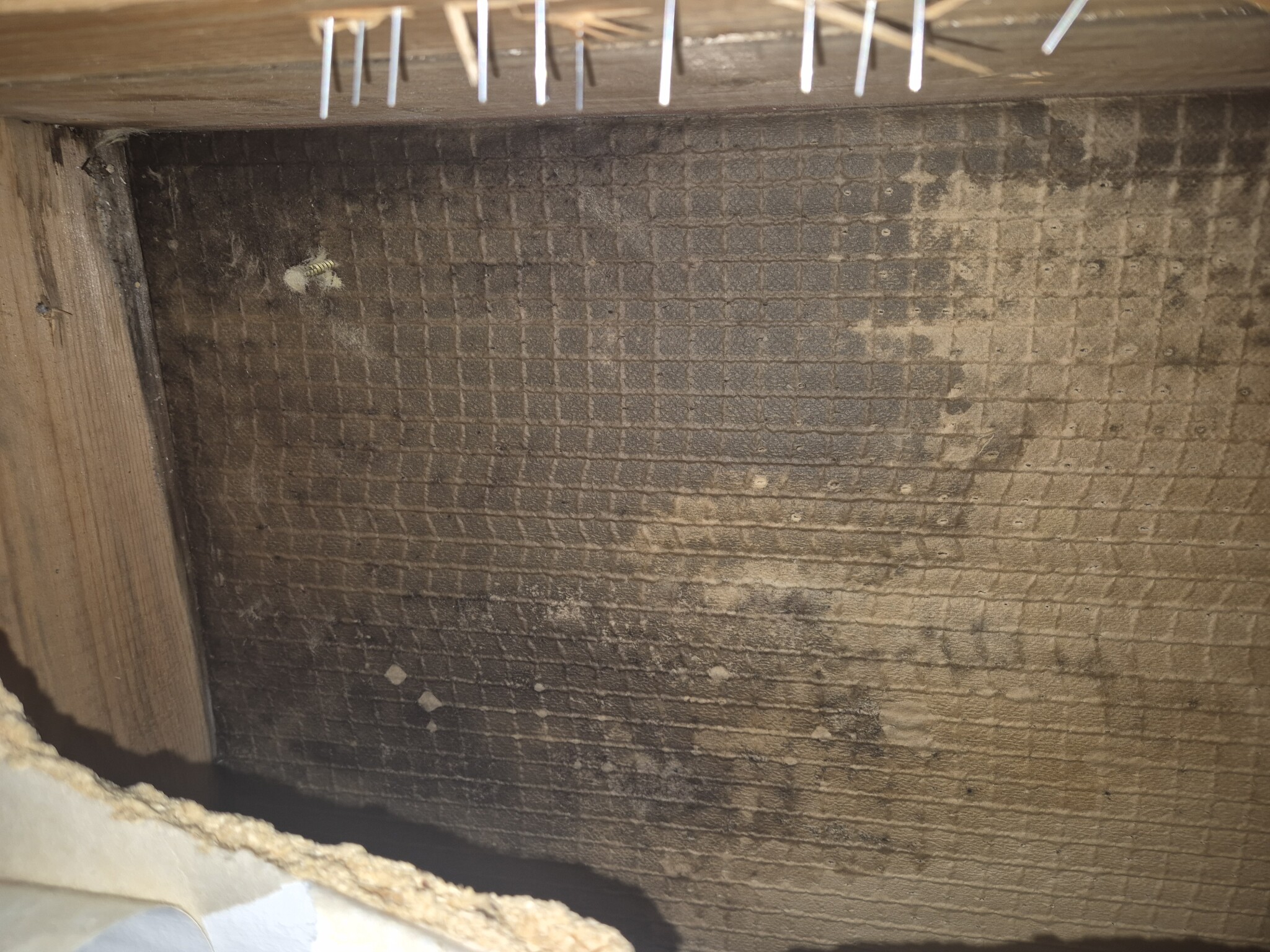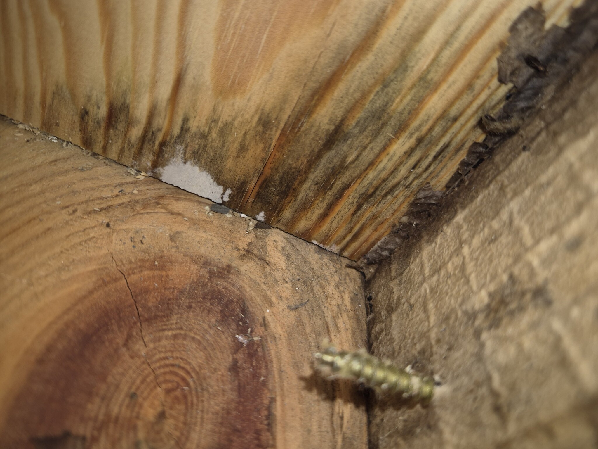 Dagen började med att vi öppnade väggen längst till vänster för att undersöka om reglarna var impregnerade, utifrån den inledande misstanken om kemisk lukt. Vid öppningen upptäcktes vad som ser ut som mögelpåväxt på en planka som använts för att fästa spånplattan mot väggen.
