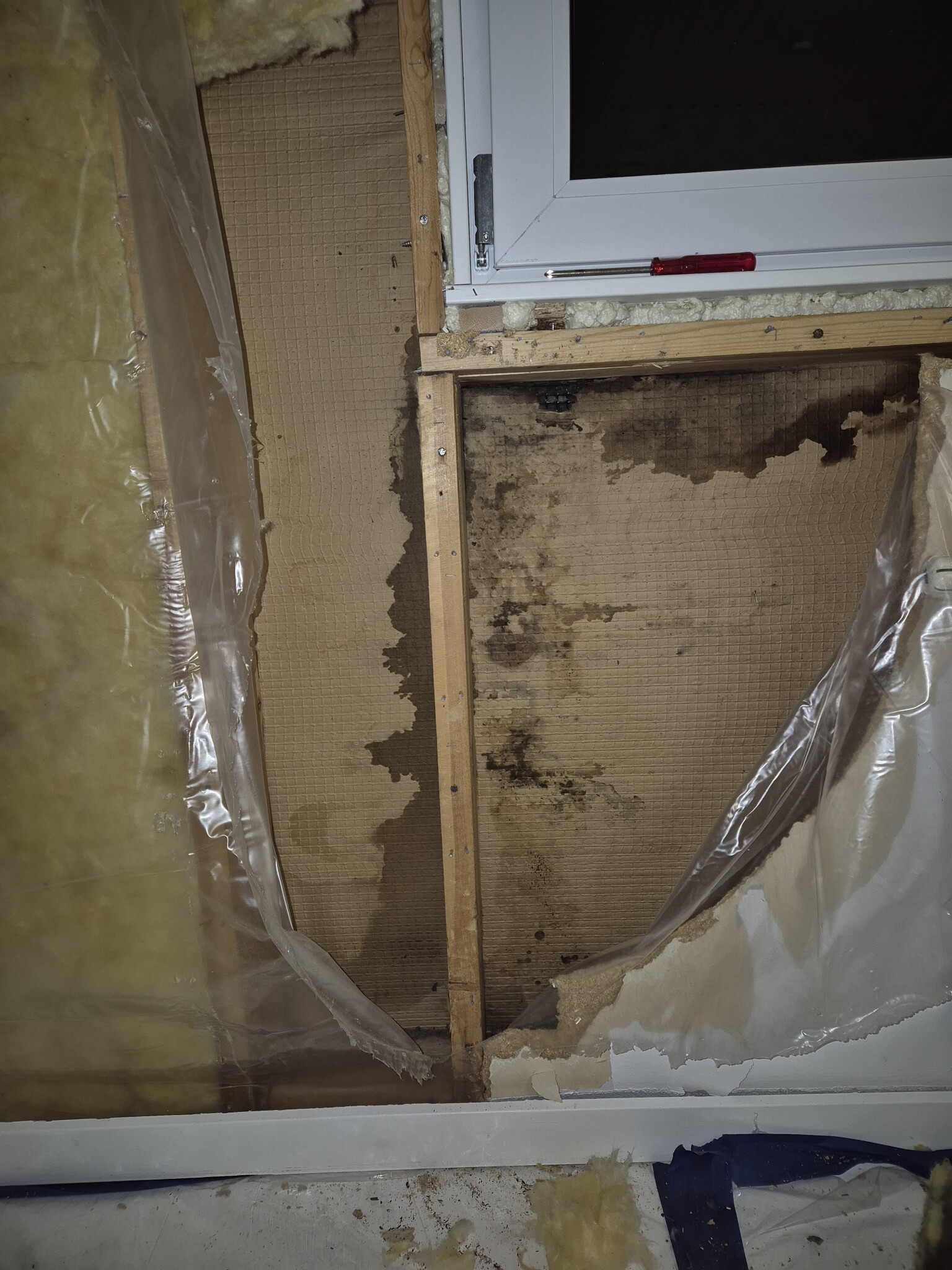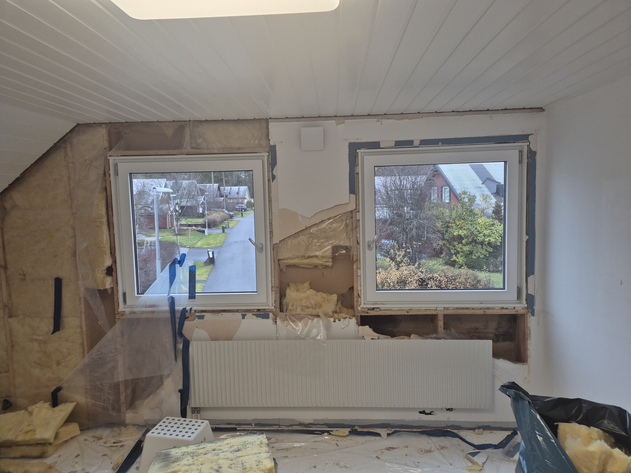 Öppnade väggen ovanför det vänstra fönstret för att kontrollera om fukten kom från taket – ingen indikation på det. Öppnade även under det högra fönstret, där konstruktionen såg nästan identisk ut som vid det vänstra.