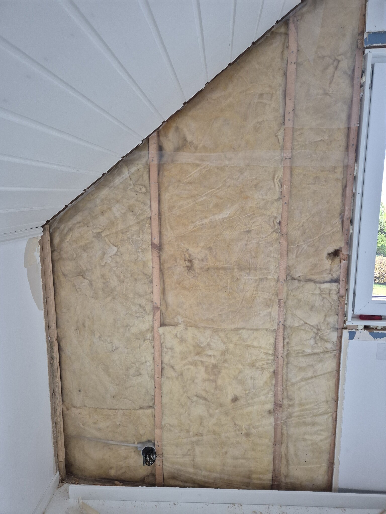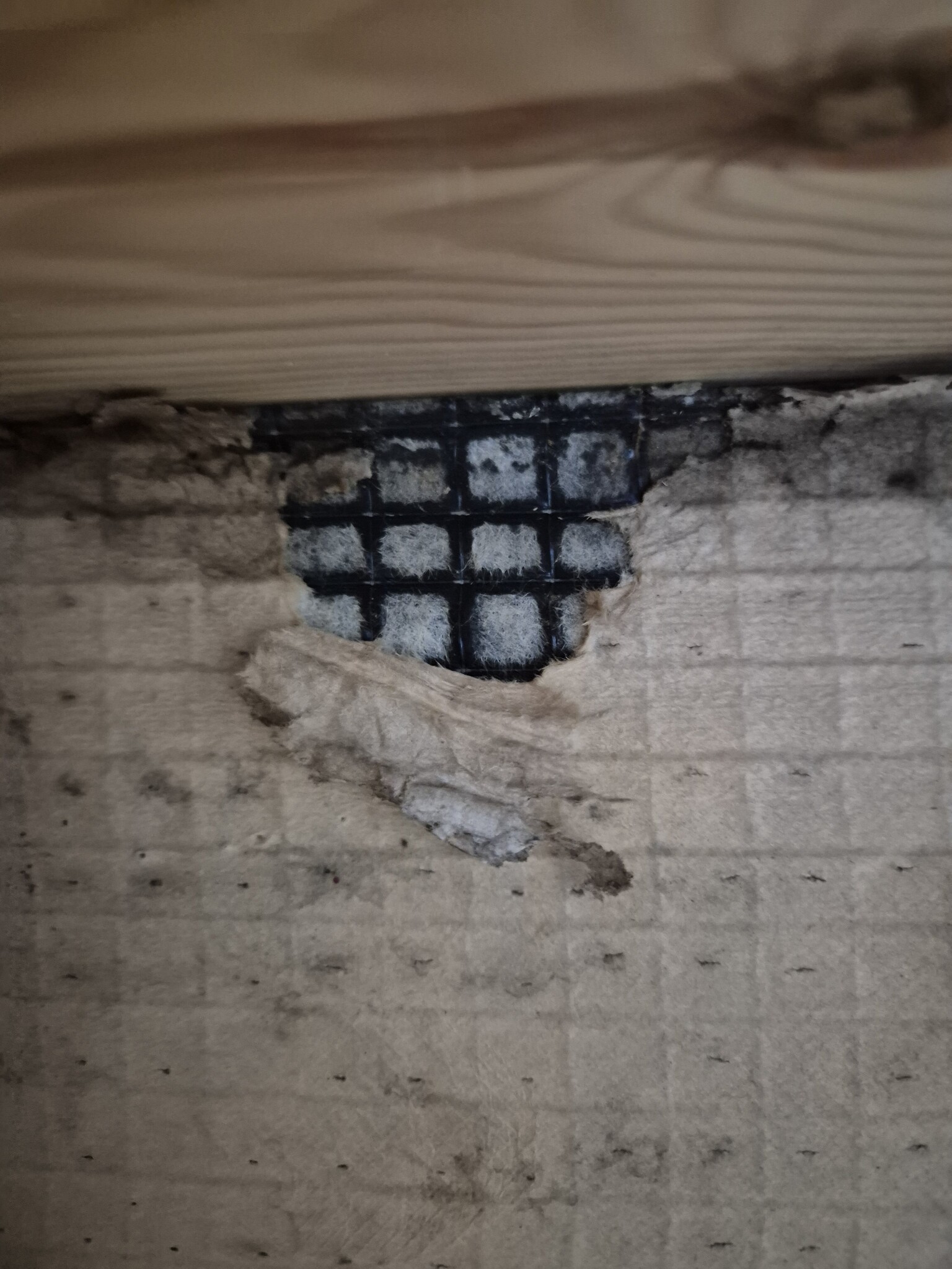 Pratat med utredaren på Anticimex som rekommenderar att vi tar in en offert på hela arbetet som underlag till ersättningsanspråket. Enligt utredaren behöver troligen hela fasaden bytas eftersom befintlig konstruktion är felaktig (vindpapp med tunn plastfilm bakom, se bild).