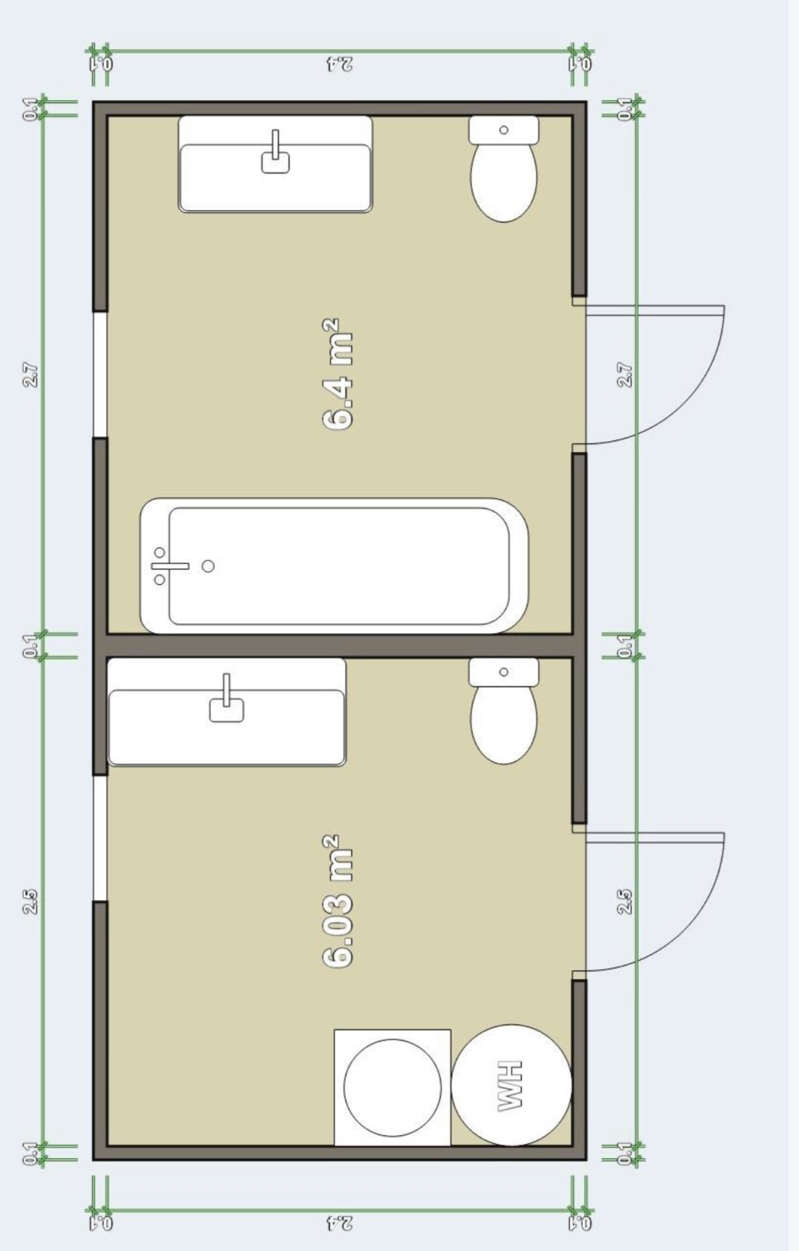 Huset är från 2012 och badrummet byggt med 450cc 45x220 mm reglar med 2,8m uppläggningsavstånd. 22mm spån, vattenburen golvvärme och fiberförstärkt flytspackel men osäkert om det är armeringsnät också. Plastmatta som tätskikt och kaklat på golv och väggar.