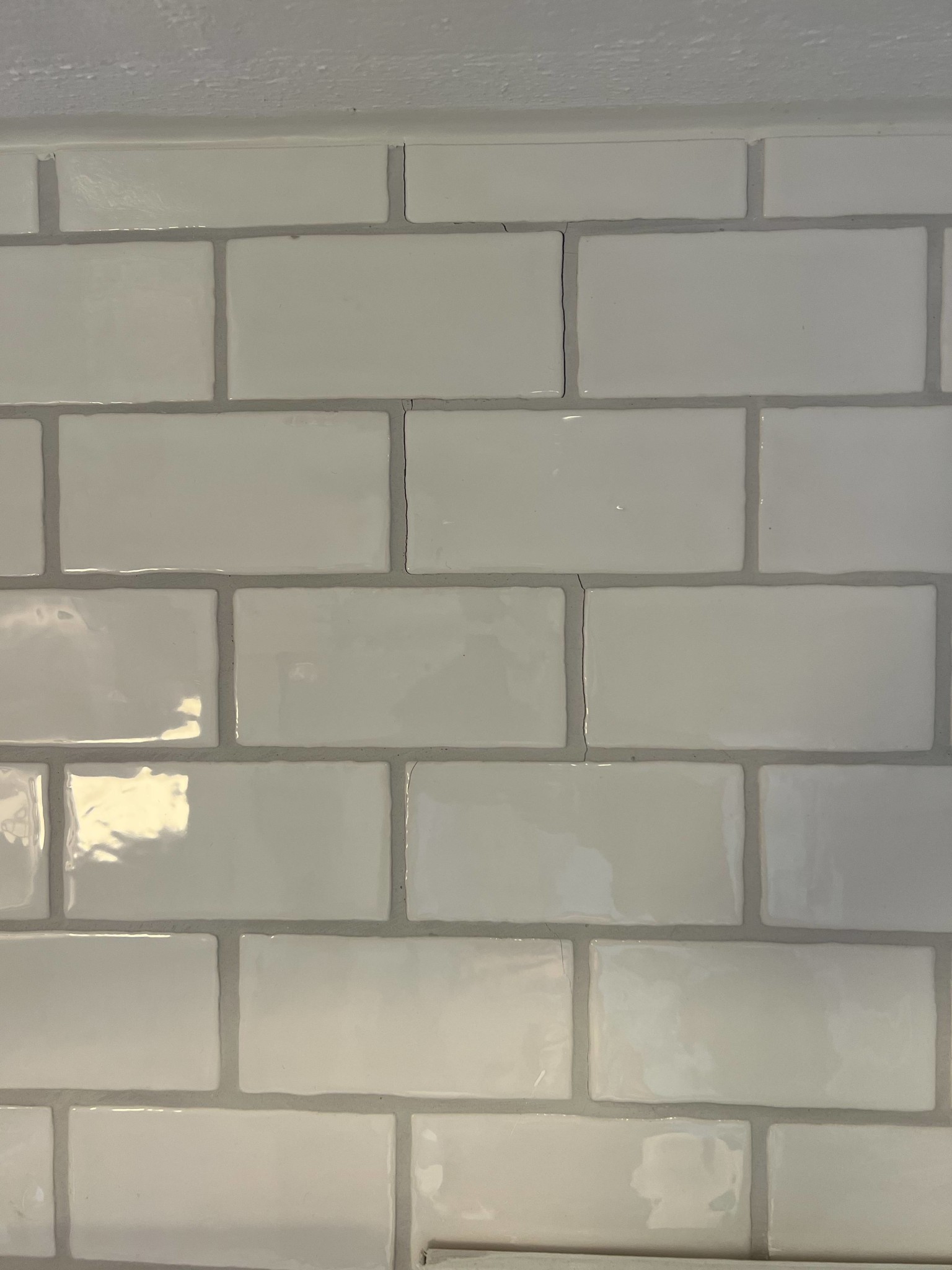 Även om jag inte fått några svar här tänkte jag uppdatera. När jag lyfte blicken finns även enstaka spruckna plattor och fog upp mot taket ovanför dörren och även ner längs golvet på samma vägg, tolkar det som en sättning i huset. Oklar ålder på den då jag inte litar ett dugg på besiktningsmannens genomgång längre efter allt han missat.