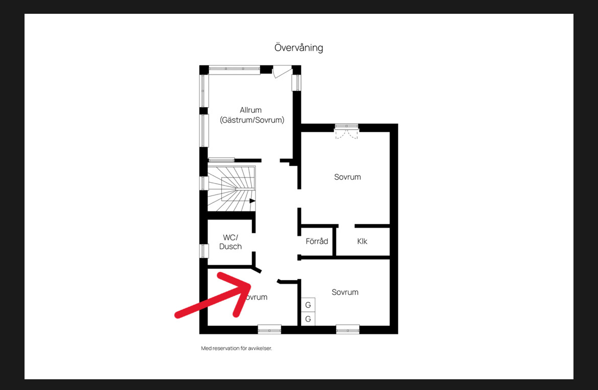 1. Hur kan vi på ett bra sätt placera dörrar? Jag har sett en lösning som jag tror är bra (se fotot med röd pil), men jag skulle gärna få inspel på vad ni tycker? Jag gillar lösningen (att bygga en vägg i vinkel) för att det inte tar yta från de nya rummen, som kommer att bli små som det är. Däremot tar den lite från grannrummet; det är också ett litet rum, men har iaf lite mer yta att spela med. Vad säger ni om den lösning jag tror på?