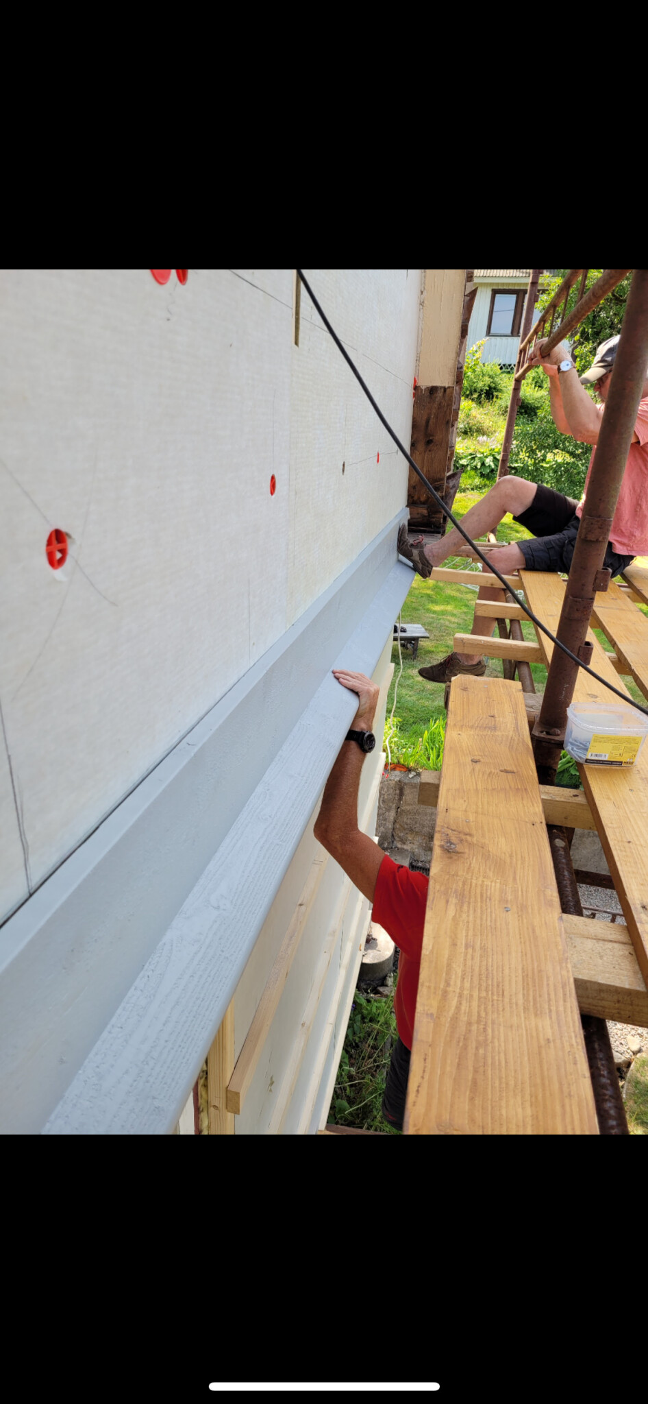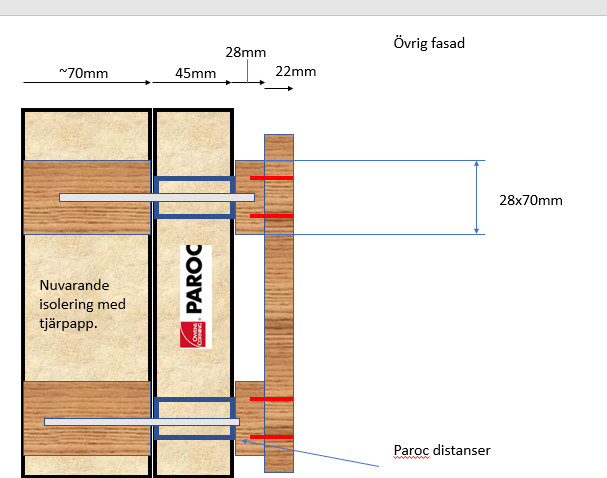 Just nu fasadbyte med ny tillägssisolering. Vi valt att spara den tidigare tilläggsisoleringen från 80-talet (den var i bra skick) som ligger bakom tjärpapp, som andas så vitt jag förstår det.