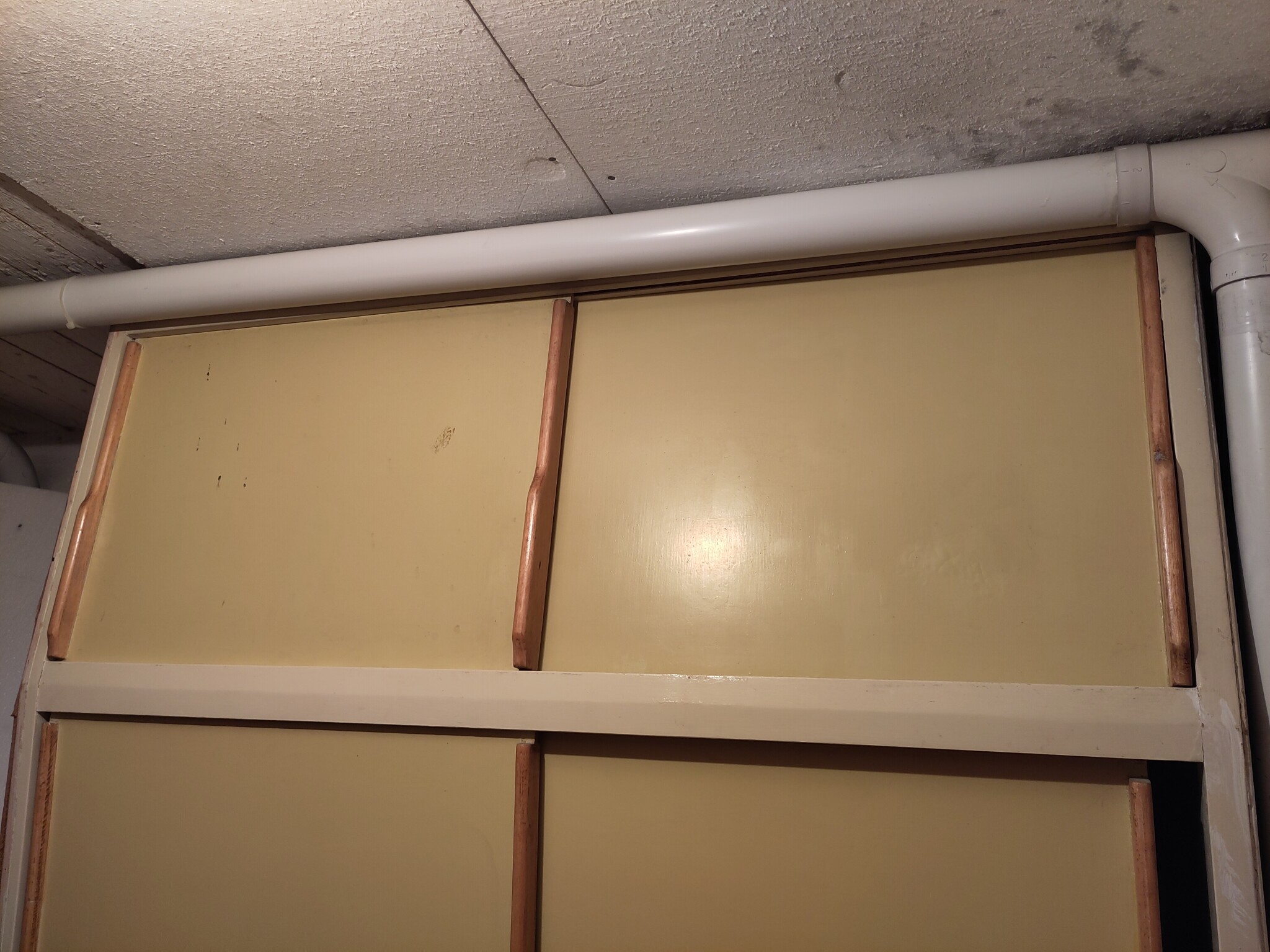Vi hade ett sånt överskåp för några årtionden sen i ett hus från 40-talet och det var bara en målad masonitskiva, ungefär 5 mm tjock gissar jag. Vi är inte säkra men har för oss att det var någon sorts lodrätt utanpåliggande list som handtag längs ytterkanten. Vi kommer inte ihåg hur långa de var. Utseendemässigt ungefär som dina lådhandtag.