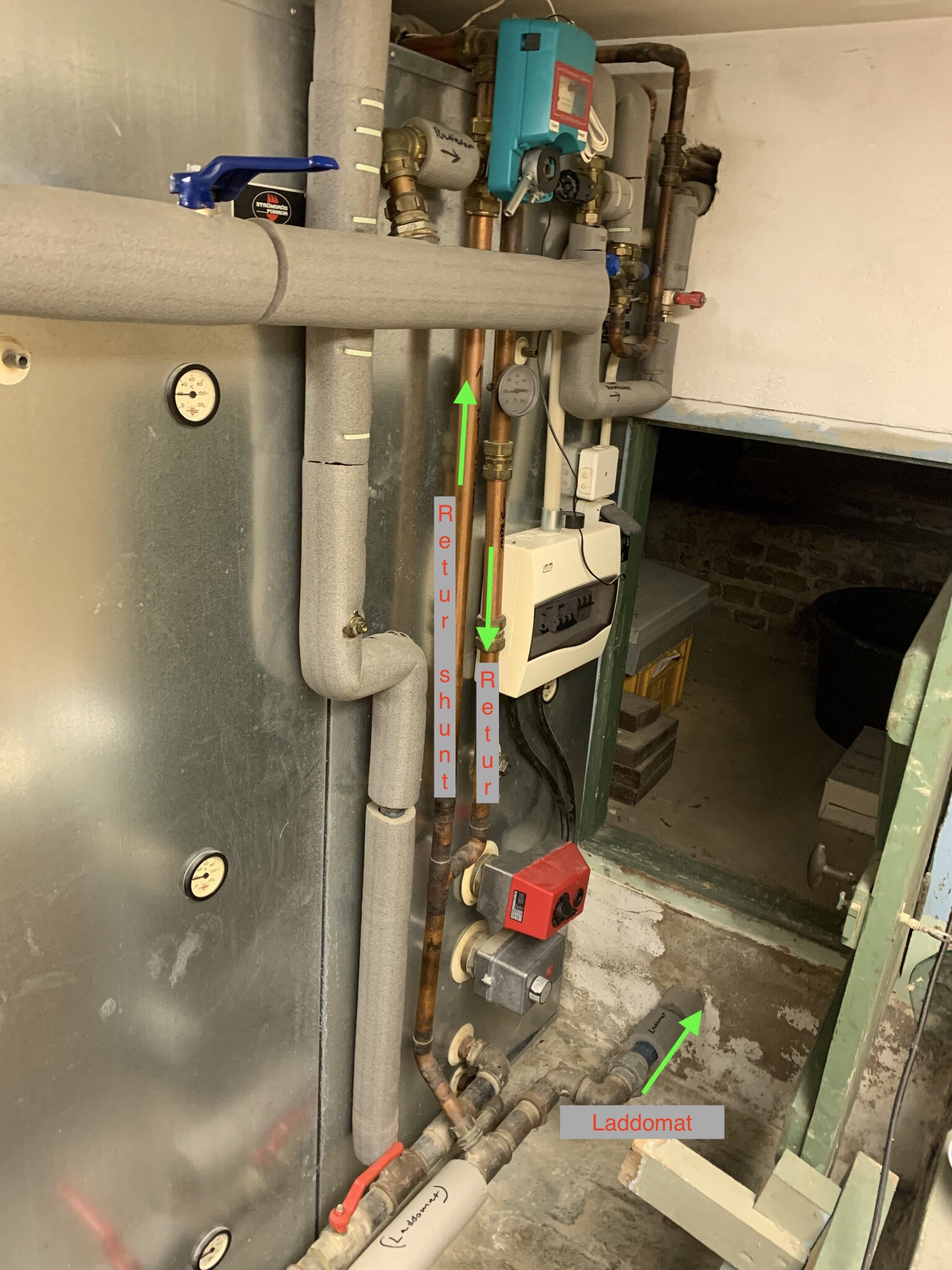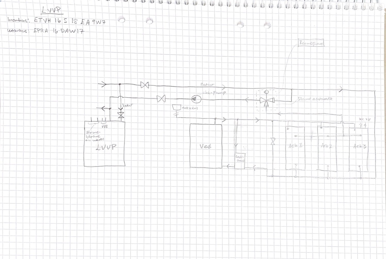 Jag gjorde en ritning över hur det är inkopplat. Eftersom det sitter en shunt-automatik på ack.tankarna, så har jag fått för mej att det då är möjligt att elda på som man gjort tidigare och låta shunten sköta regleringen? Då borde inte LVVP få för varmt vatten på sig från ack.tankarna.