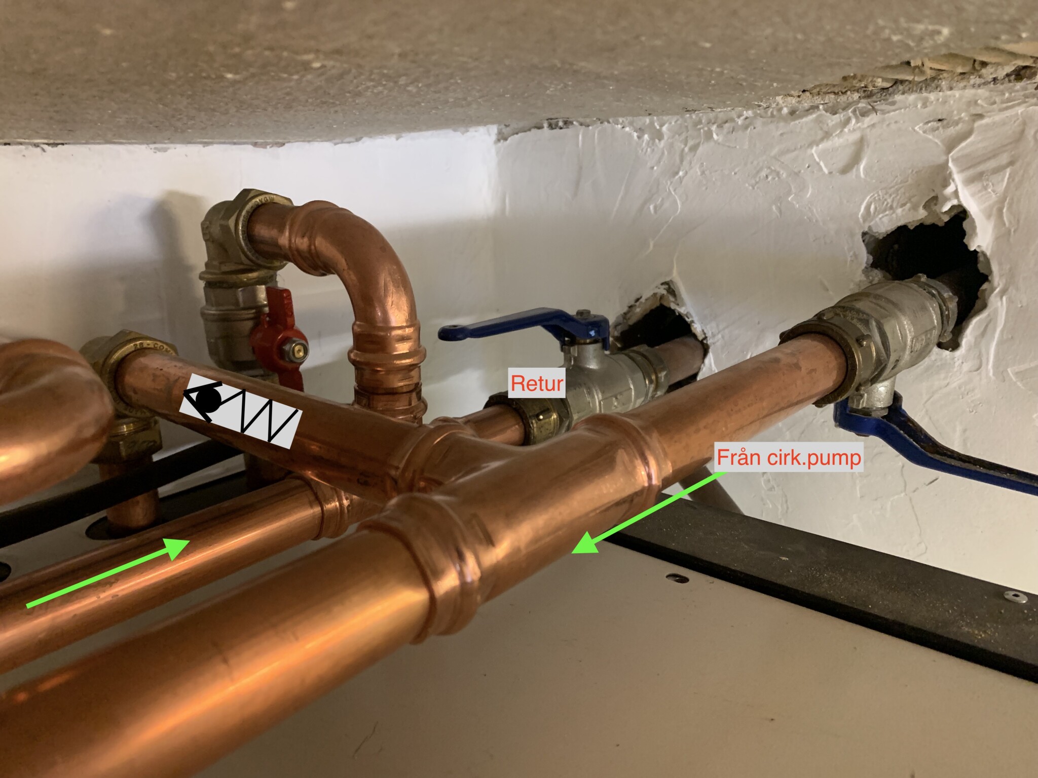 Det ser ut som man skulle behöva stänga en ventil vid vp, så inte cirkpumpen för veden pumpar vatten genom vp (vattnet ska ju till rad kretsen). Stänger du den vilken så borde ju heller inte varmt vatten från vedpannan kunna nå vp.